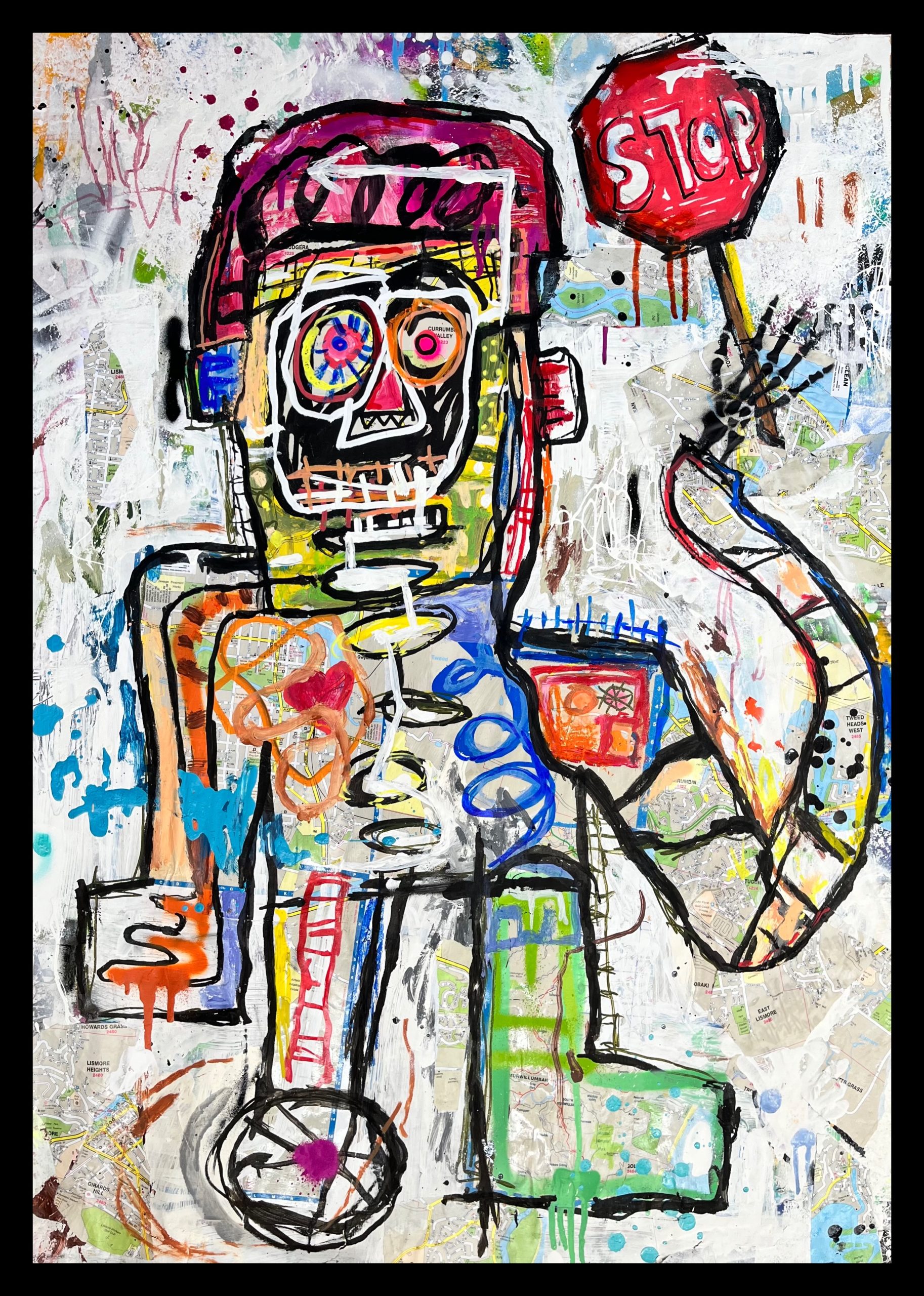 This original Artwork is a continuation of my current series, playfully exploring the merging of Man & Machine and was created from ‘vintage’ street directories and paint.
