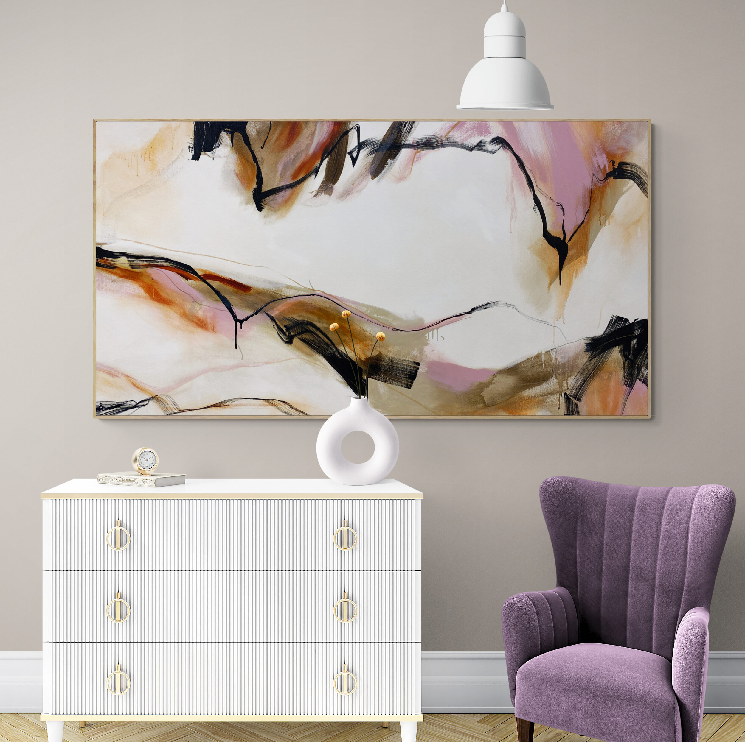 It’s intriguing mark making combined with its restful and calm palette of beautiful soft blush and subtle pinks, warm ochre and black, mixed with cool beige and white neutral tones makes this statement piece work so well in most spaces.