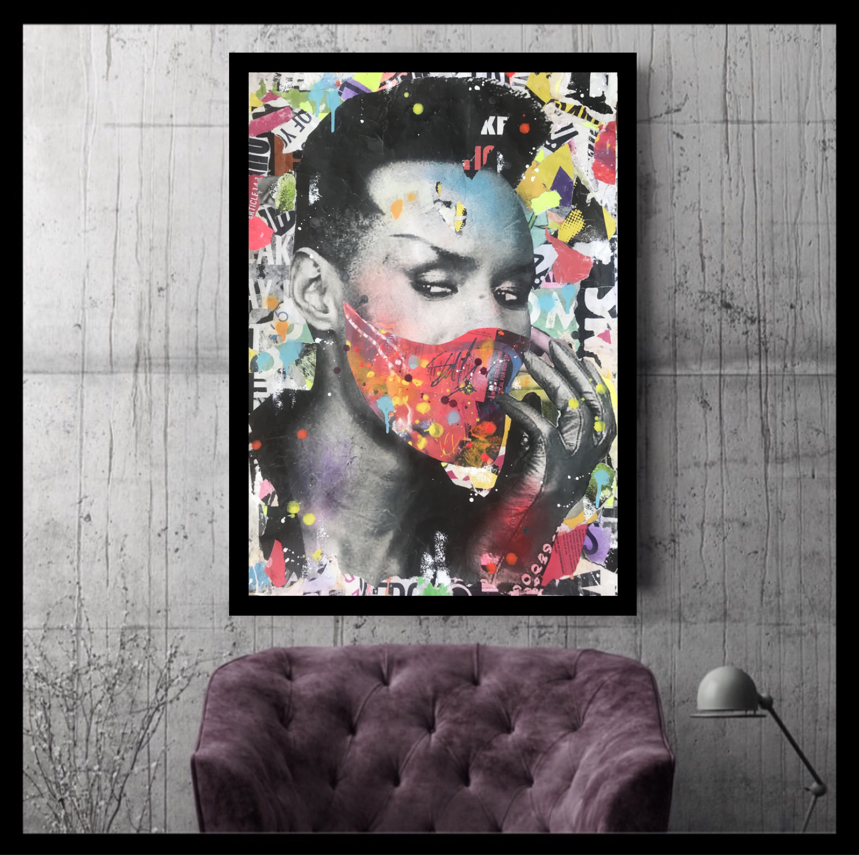 The background was built up with layers of paint and paper before the main image of 80’s Music Icon: Grace Jones was added and overlaid with paper and paint and given the most essential fashion accessory in the modern world, a face mask.