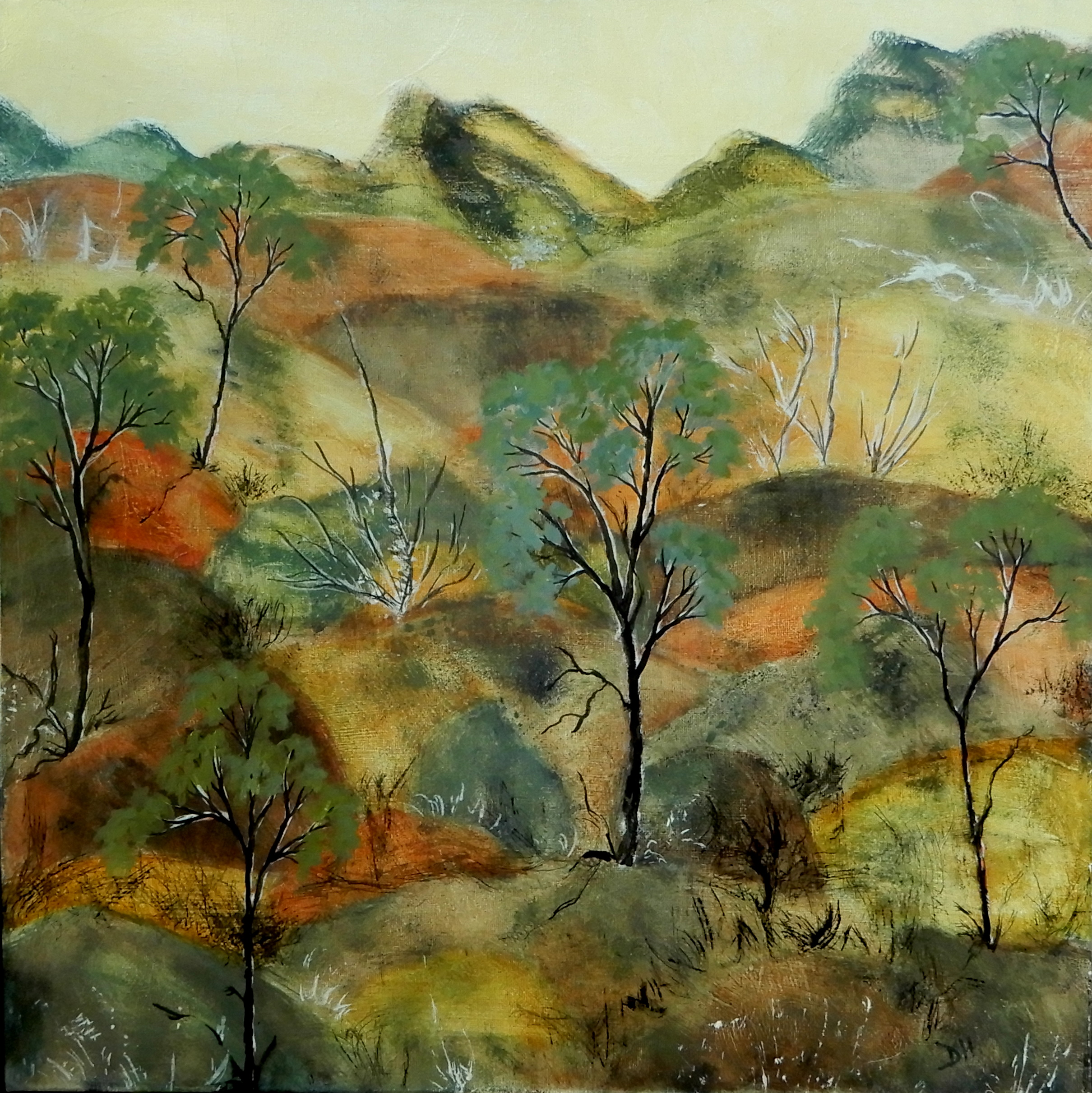 My impression of granite rocks on a hillside, bearing the marks of weathering over geological time and the greenish growth of lichens that have co-opted their surfaces. Slender snowgums reach for sun and light.