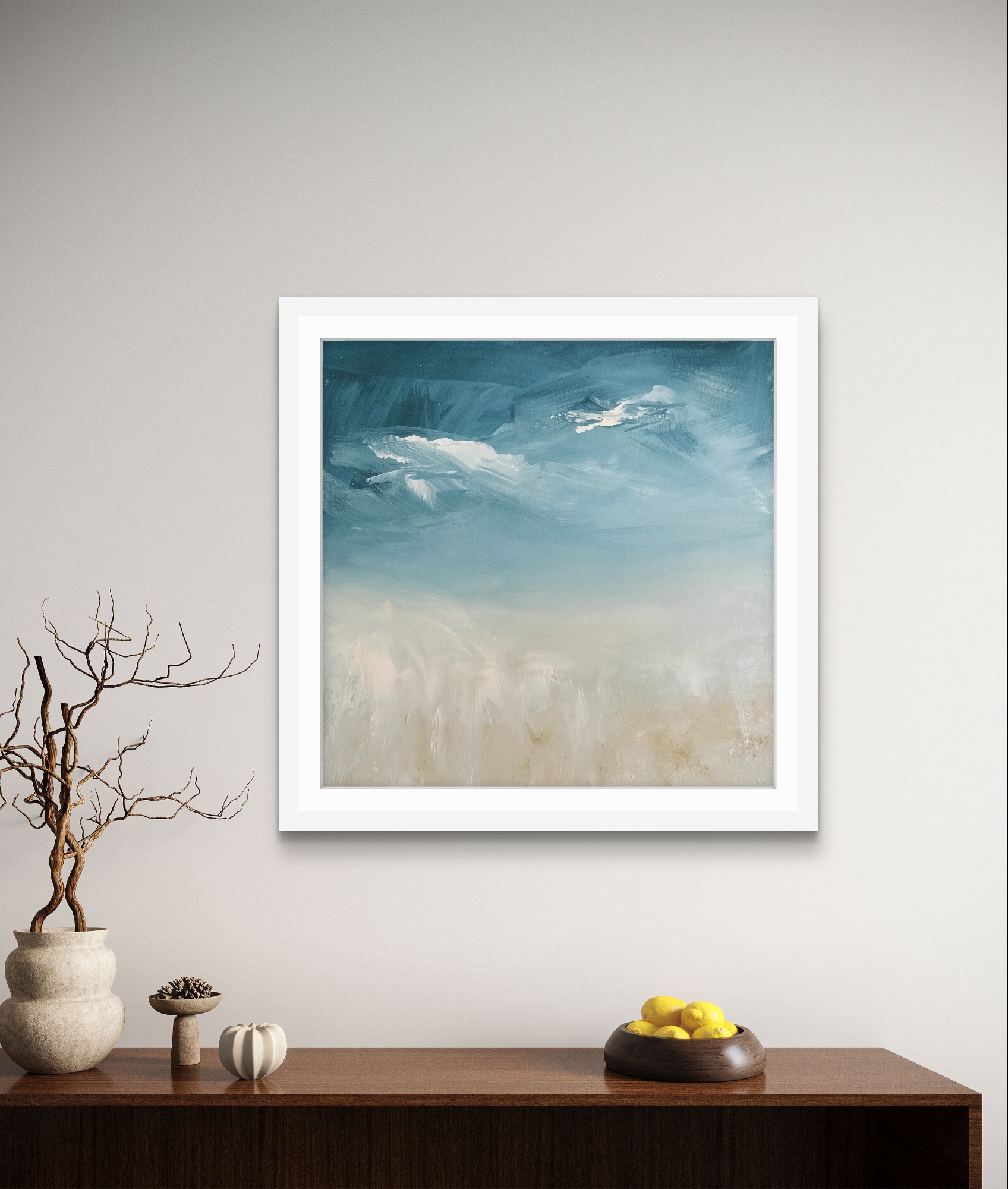 This semi-abstract painting features a serene, atmospheric composition. The upper portion is dominated by sweeping strokes of blue and white, suggesting a sky with soft, cloud-like formations. The lower half transitions into lighter, beige and off-white hues, evoking the texture of grass with a misty horizon. The brushwork is fluid and expressive, blending colors to create a sense of depth and movement. Framed in white, the painting conveys a tranquil, natural landscape with an abstract twist.