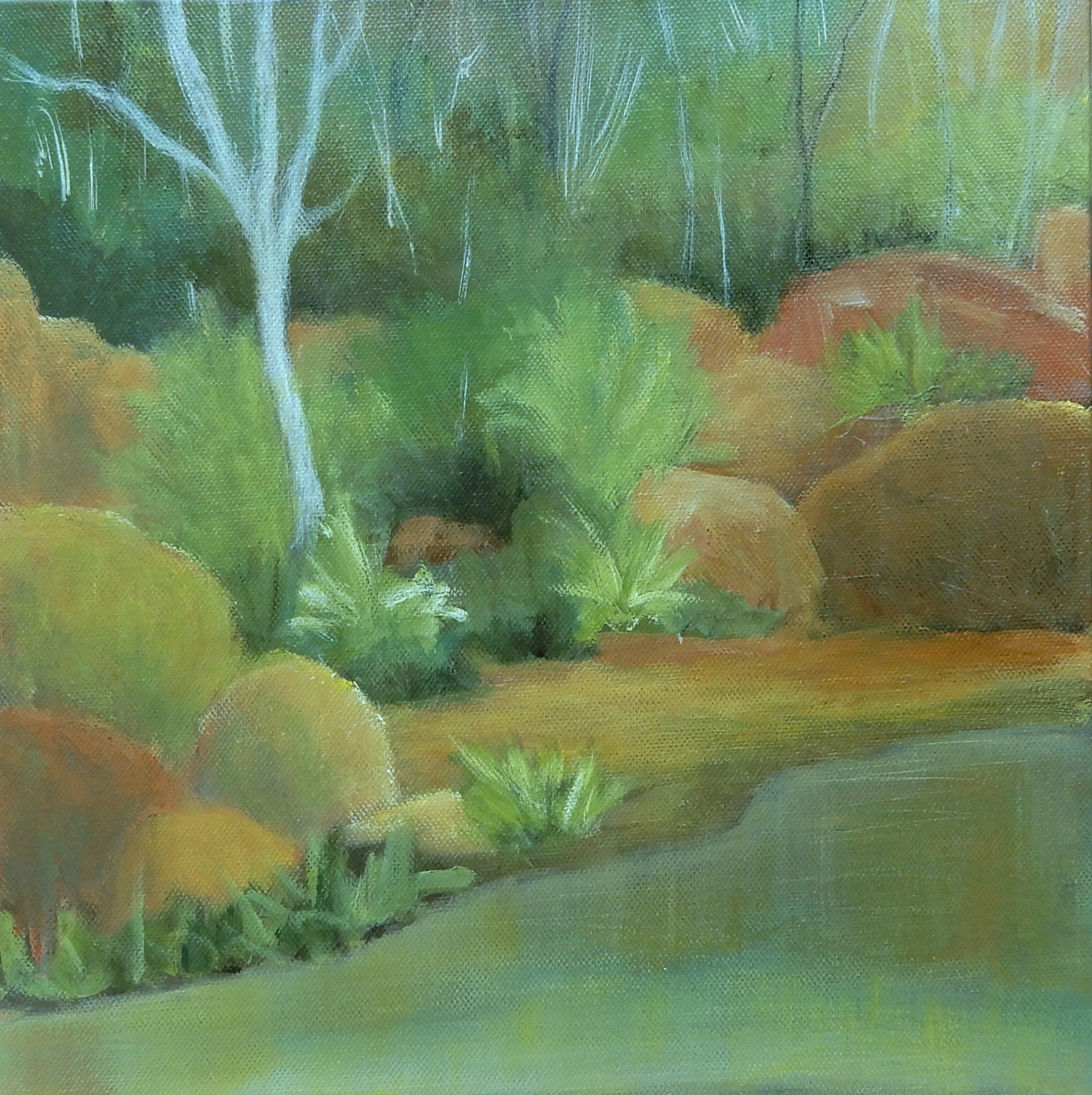 I had a hankering for painting in a more impressionistic style, this time with greens – a reminder of new life after rain and new beginnings. Over the last six months this small creek has swollen and all the grasses and surrounding bush have turned green.