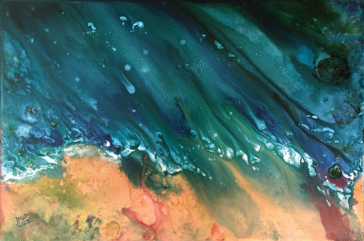 Green And Gold Flow – Abstract overhead view of a shoreline. Abstract view of a shoreline created by manipulating acrylic paint and ink by hand on a canvas.