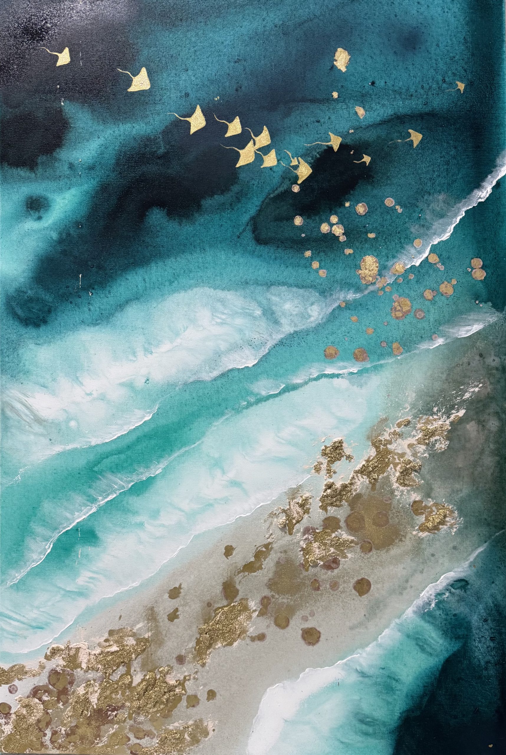 The work is painted on a premium, gallery-quality stretched canvas. The deep blues, teals, and greens are achieved using deeply pigmented high-flow and heavy-body acrylic paints. Natural sand (sourced from Maroubra Beach) is meticulously integrated into the paint to build the textural dimension of the shallow coast and seabed. The small pink kayaks add a touch of human scale and narrative. The entire surface is sealed with a high-quality, non-reflective matte varnish, ensuring protection against UV damage while giving the piece an elegant, soft finish that enhances the organic textures.