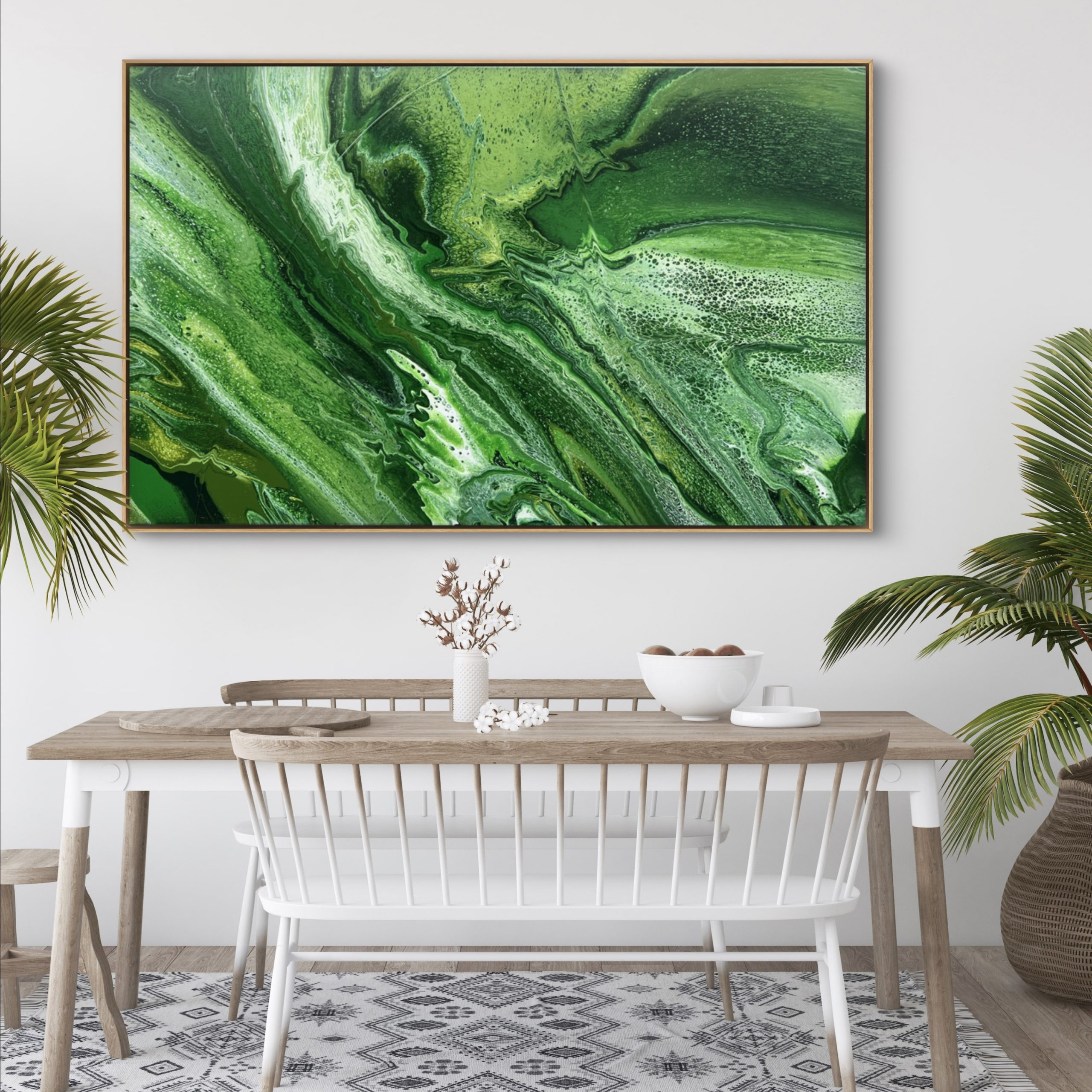 This beautiful piece is 160cm x 100cm and features shades of stunning fresh greens and white acrylics. I will sign the bottom left corner once the orientation is confirmed just in case you’d like it hung a different way.