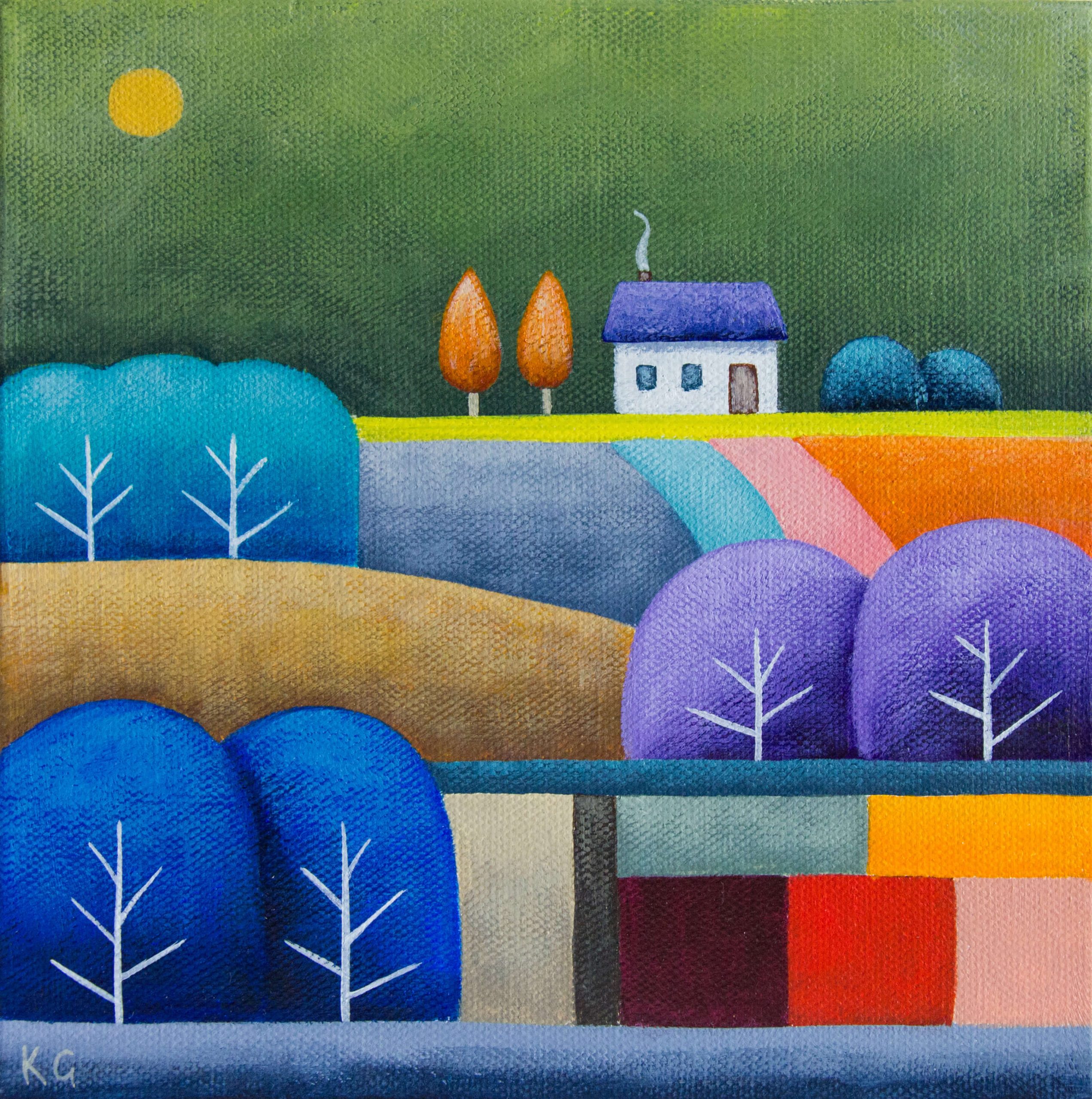 Green Glow – Petite by Kate Graham. This small landscape features a dramatic green sky with house sitting on the horizon. Interwoven below is a patchwork of blue, purple and yellow fields and trees below. It is an almost surreal rural scene that celebrates colour and composition. Painted in a naive style to bring a sense of charm and delight, painted with dry-brush effect to give it a textured feel, colours are woven together in a patchwork of harmony and sometimes disharmony. The flattened perspective gives the composition a naive and whimsical feel. Small enough to rest by itself on a shelf amongst books and knick-knacks. Painted on quality canvas, wire on back so ready to hang. Sides painted in continuation of composition, so no need to frame.