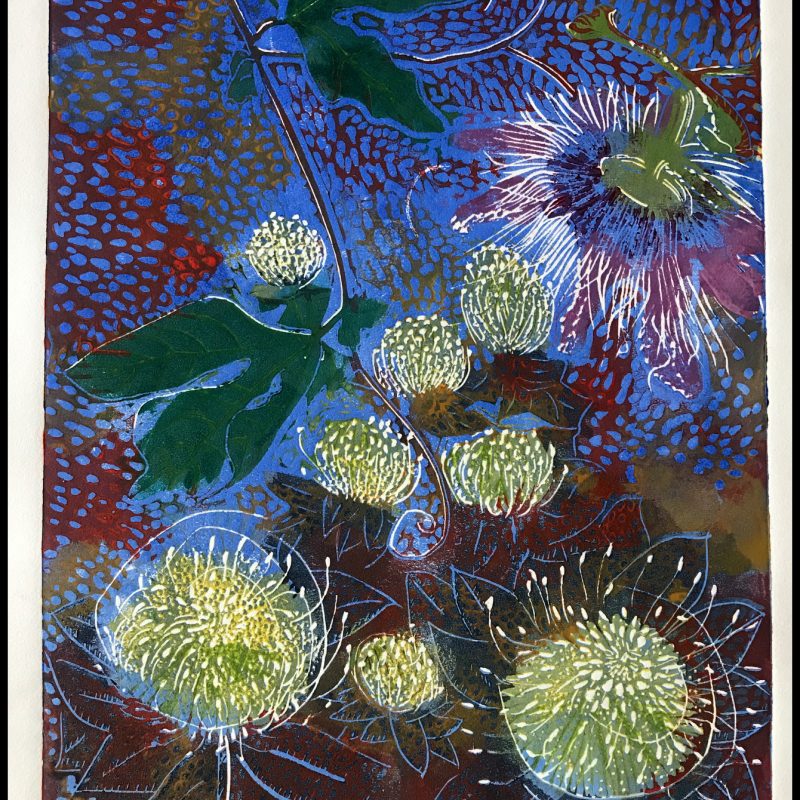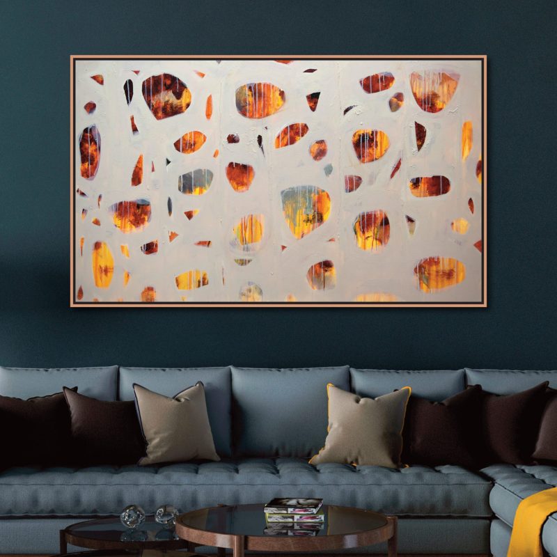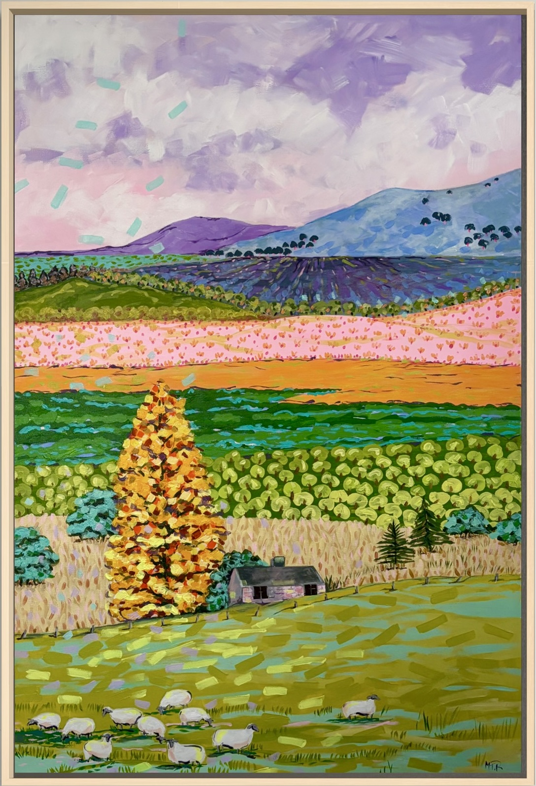 This acrylic painting on a stretched canvas comes mounted in a floating frame made from recycled timber.