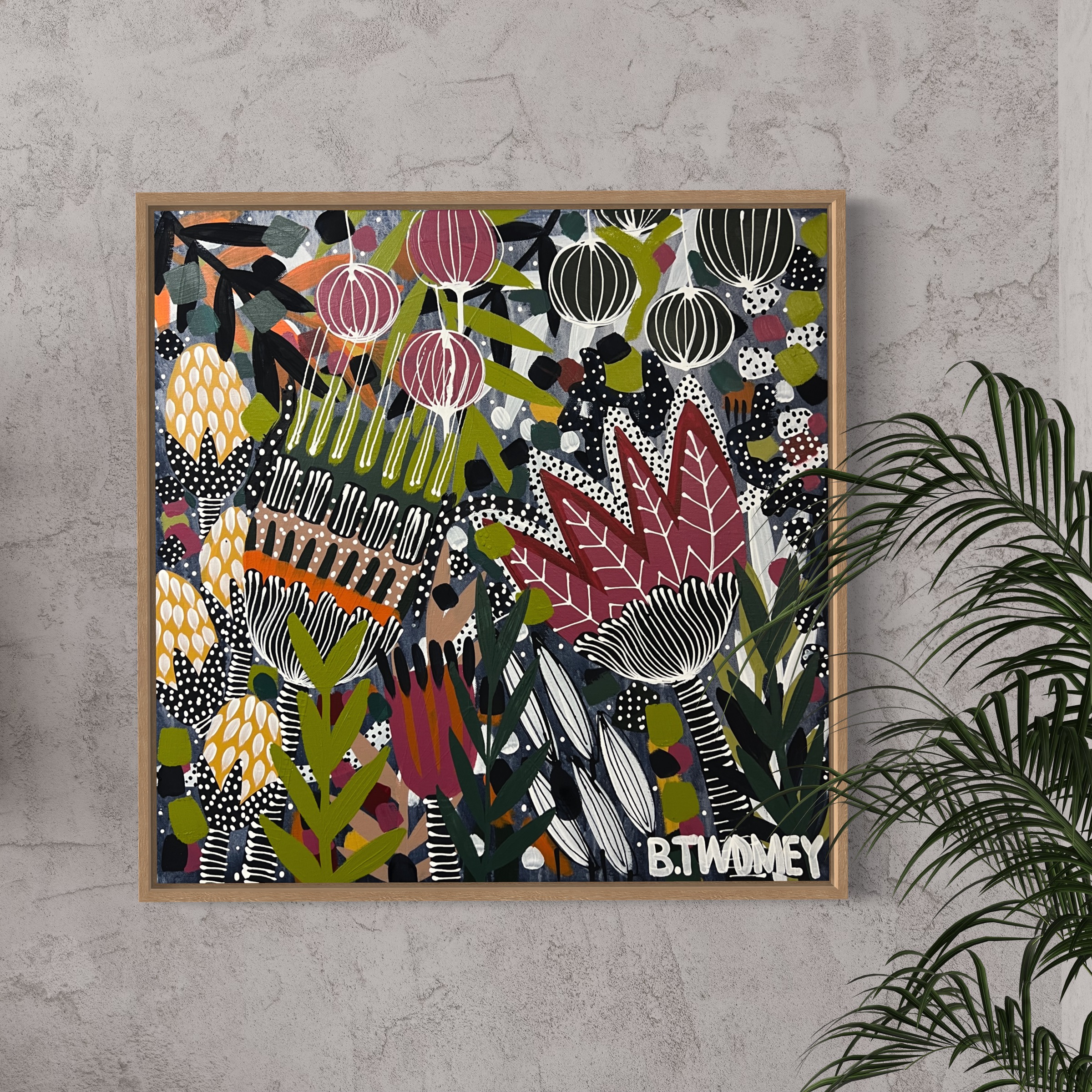 An original artwork on triple primed gallery quality canvas, ready to hang in sustainable hardwood float frame. 61cm x 61cm canvas size (64cm x 64cm framed)