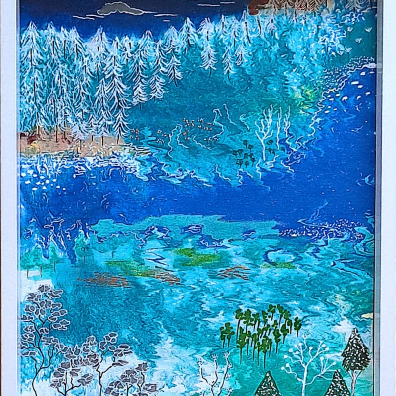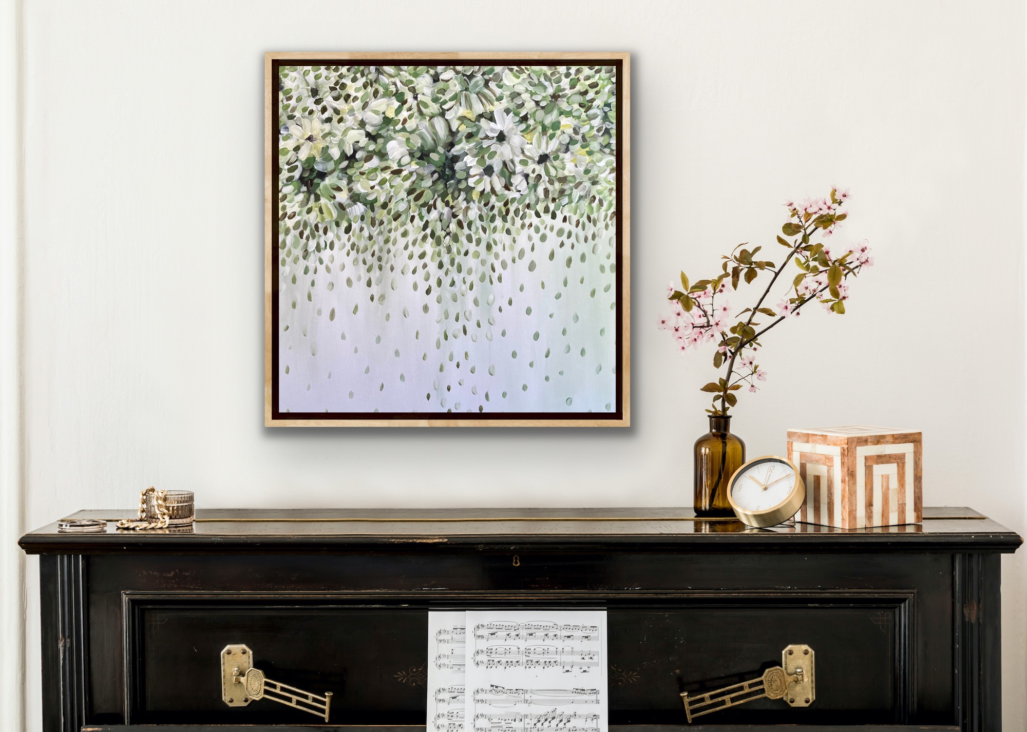 Green Sapphires by Theo Papathomas – Weeping green leaves against the beautiful white flowers, dancing in the sky like musical notes creating their own songs. Capturing the beautiful soft colours of the petals weeping onto the landscape, creating so much depth to the painting . A very peaceful and tranquil painting. This painting is painted with Acrylic paints and framed in natural wood. The painting is signed and dated 2020 at the back and comes with a certificate of Authenticity.