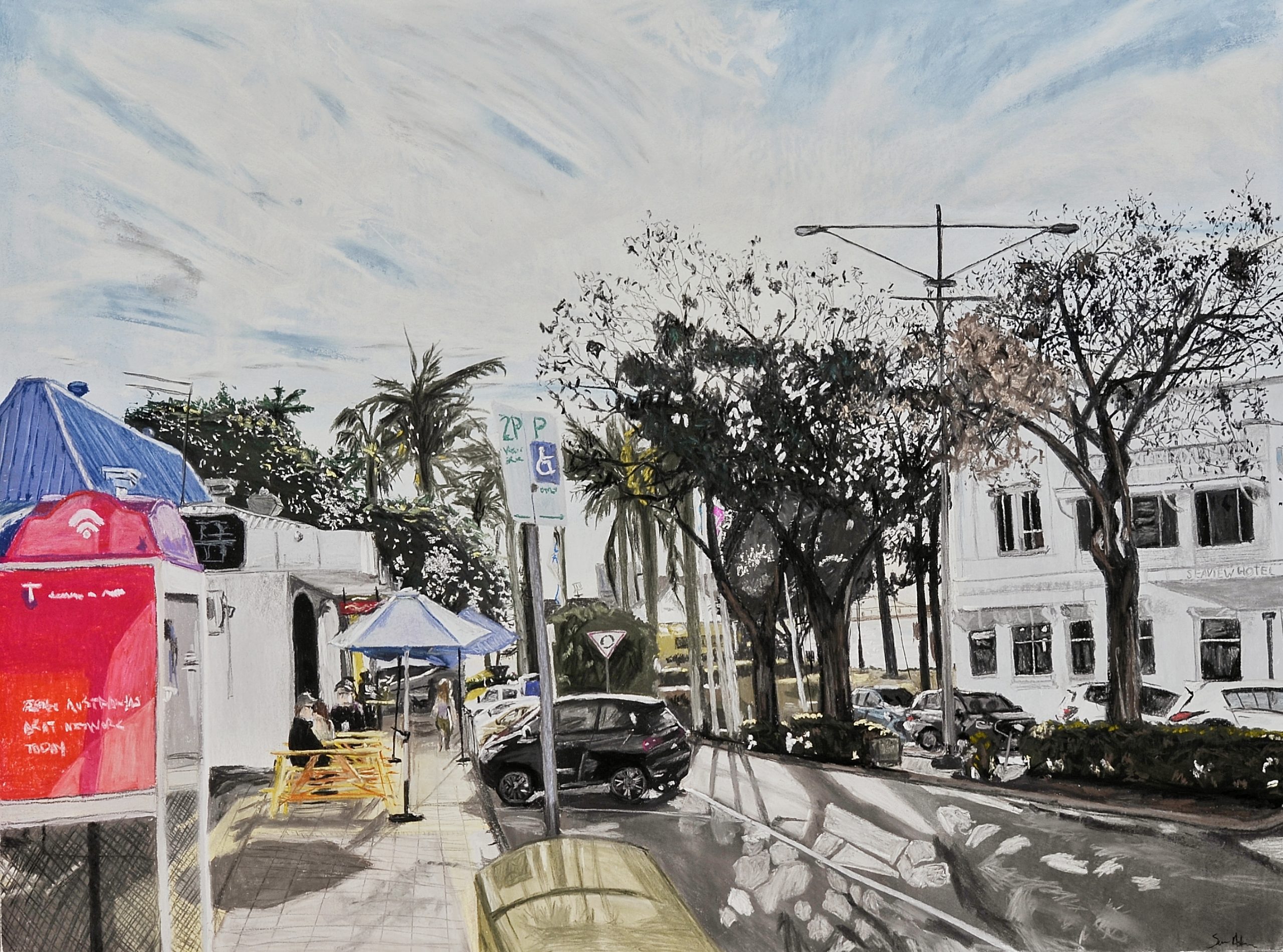 When I think of the moment I captured in this piece, I can still feel the sun, the light and the warmth right on my face. Meeting my family for breakfast, walking down Gregory St to the cafe I couldn’t help but be caught by way the way the sun lit up everythigng around it while providing such contrast with the buildings, trees and vehicles in front of me. The way things like the Telstra box and flags shone out in colour aginst a backdrop of shadow and neutral tones was quite astounding to me. I used very neutral tones and greys against the bright colours of the cafe strip to create imbalance and contrast, while bringing as light play into the piece through shadows and highlights as possible. I hope that warm feeling resonates with you as it did with me.