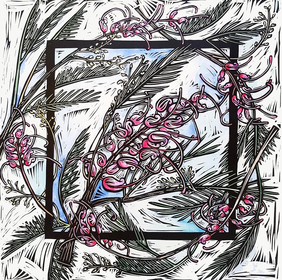 A delicate wreath of grevillea flowers and its leaves encircle and entwine with a central geometric shape which frames a larger grevillea filled branch. Carved in a gentle and organic way into the lino surface the print retains marks from the carving process which hold an energy and flow reflective of these flowers in nature. Tonal watercolour washes fill the spaces between the carved areas adding textural colours which echo the flowers natural hues.