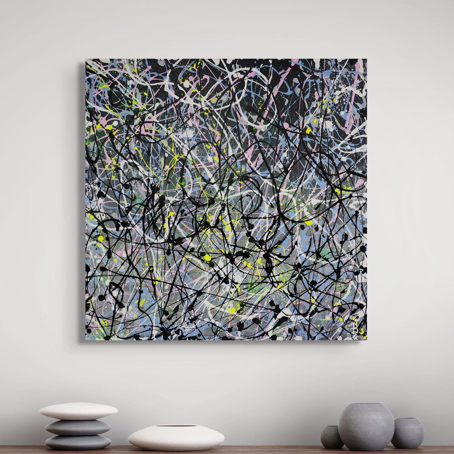 The effects of this spontaneous and unique colour composition of this painting gives it a vibrant energy, movement and intrigue. Darker hues of grey toward black bring a  moody aspect to the artwork while bright and vibrant colours bring light to the work. While a single hue of grey may seem a little dull, various greys work well together especially with accented colours. It lends itself to a sophisticated aesthetic and is considered a stylish colour for interiors, design and fashion.