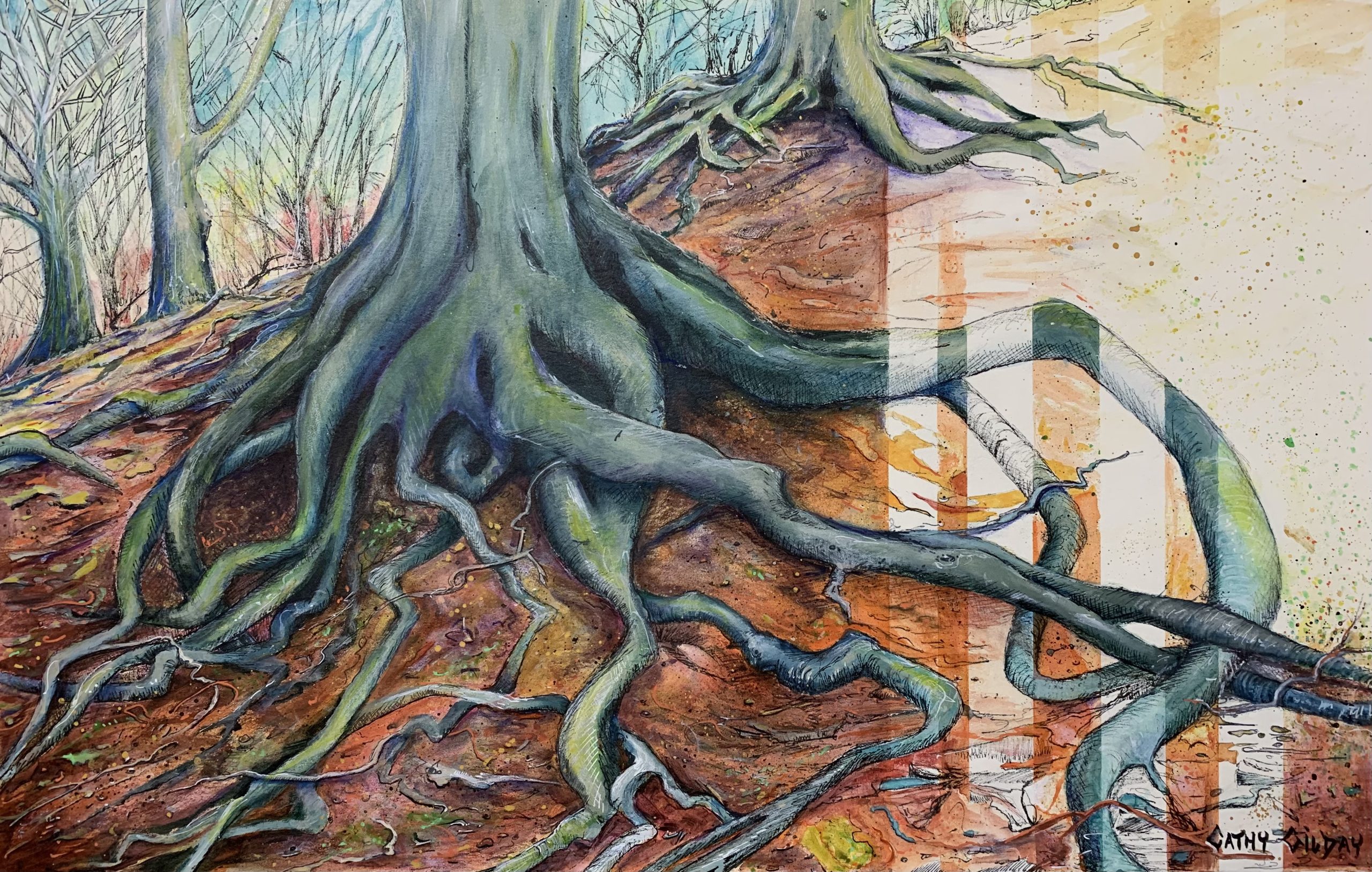 Grounded by Cathy Gilday – I love to paint trees, especially one’s with exposed and twisted roots. In this painting, I have made them the focus, perhaps a “worms eye view.” This painting is one of a series, where I tape off strips of the paper and paint in my composition. Once the tape is removed, I then draw in these blank areas, using ink and washes. Check out the rest of the series on this site. Requires framing.