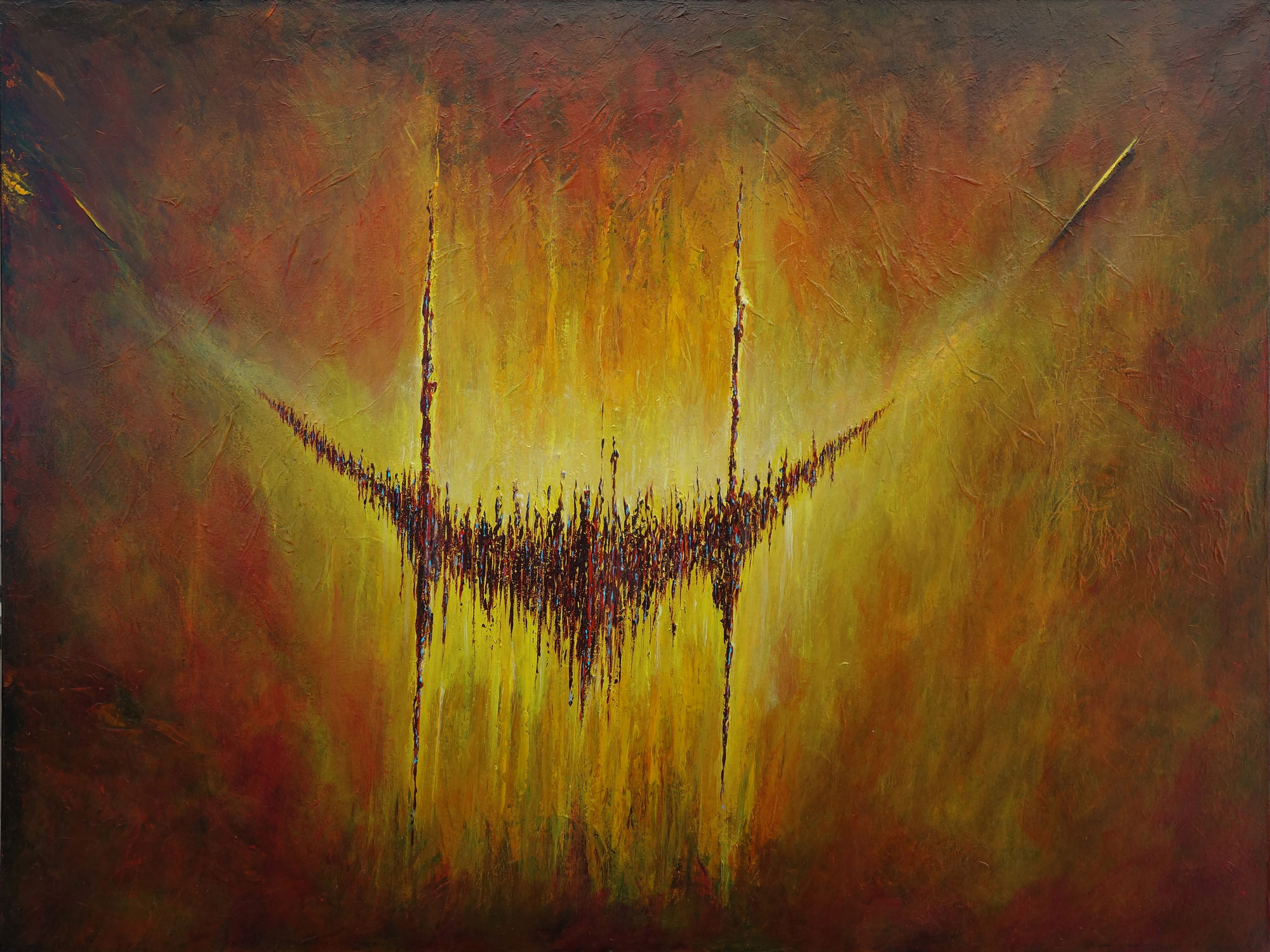 Growl by John N Mason – Soundscape Painting. Original artwork.  The abstract representation of the sound of an aggressive low growling of a scary creature. Three-dimensional features from the heavy impasto. Acrylic on stretched cotton canvas 48″ x 36″ (91.4cm x 122cm) Black Box framed ready to hang.