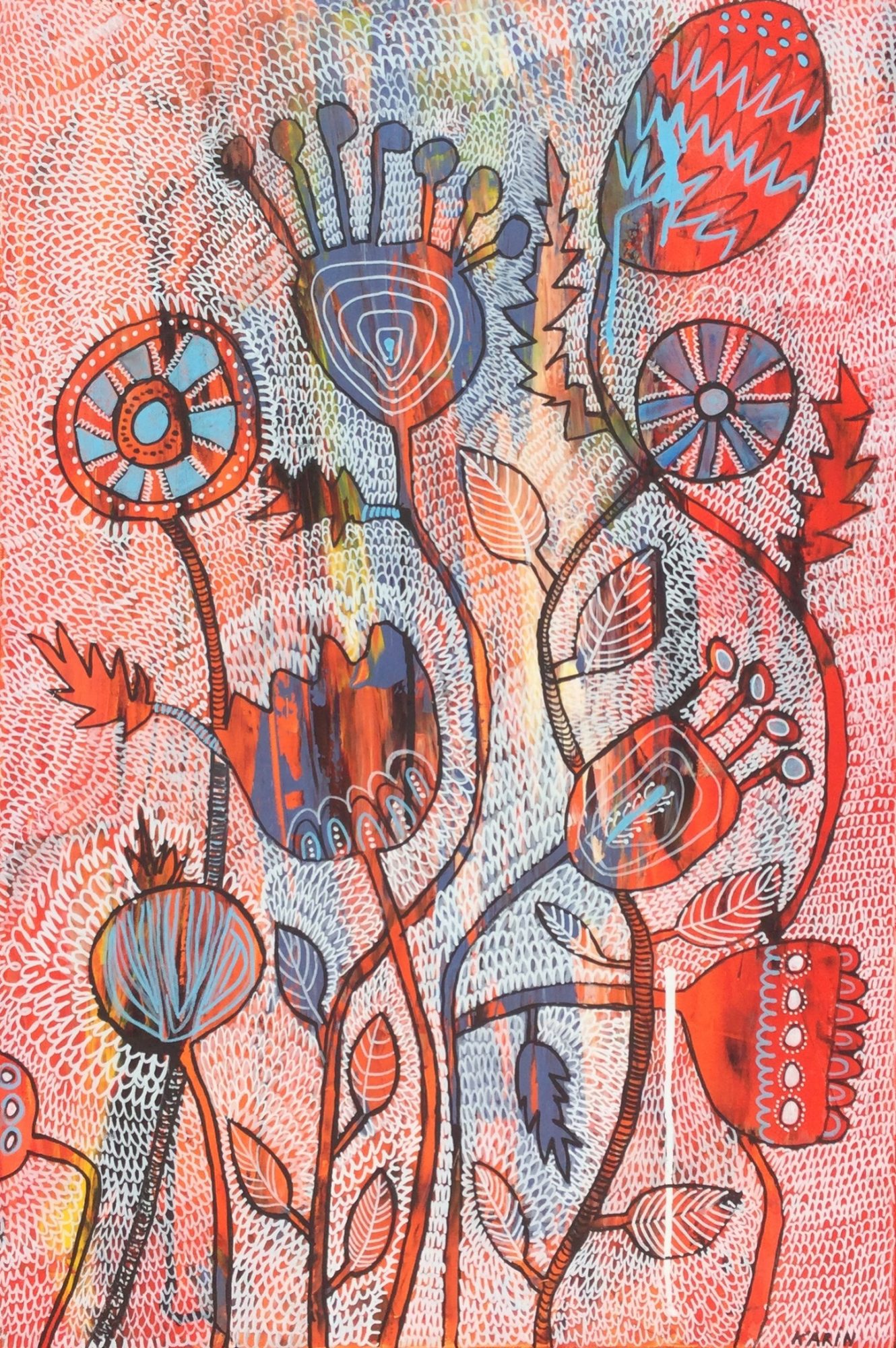 Growth became my New Yew resolution painting completed just before New Years Eve ready for the New Year. I decided this is my year of growth to reach up and grow personally, mentally, and creatively to take on challenges with a sense of joy to rediscover. Growth is a bold piece filled with the patterning (the patterning of Life) the bold plants are us, the people, the individual, you, me! Be bold always reach high and be prepared to grow.