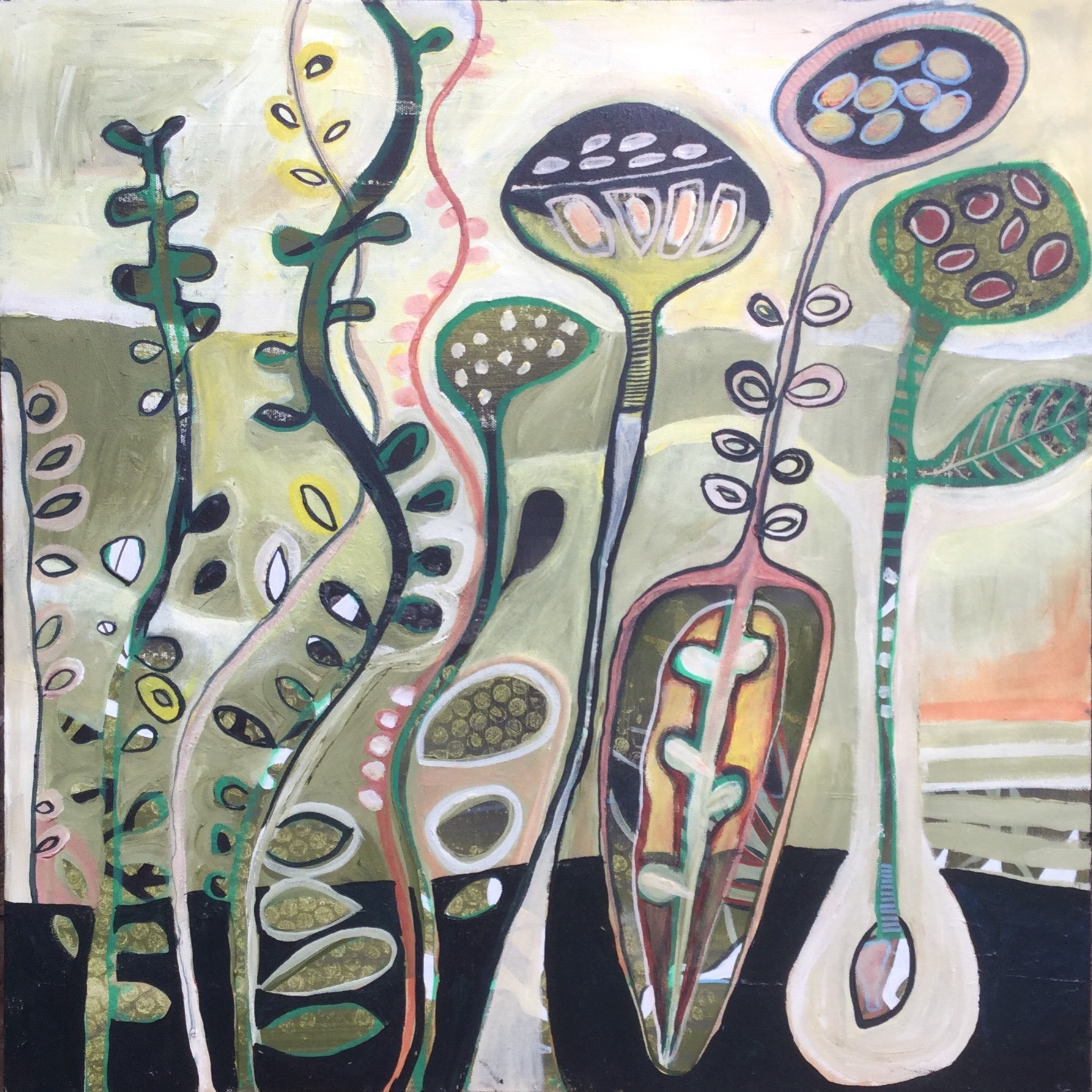 Abstract acrylic painting inspired by plant life on land and in water. Stylised and organic shapes