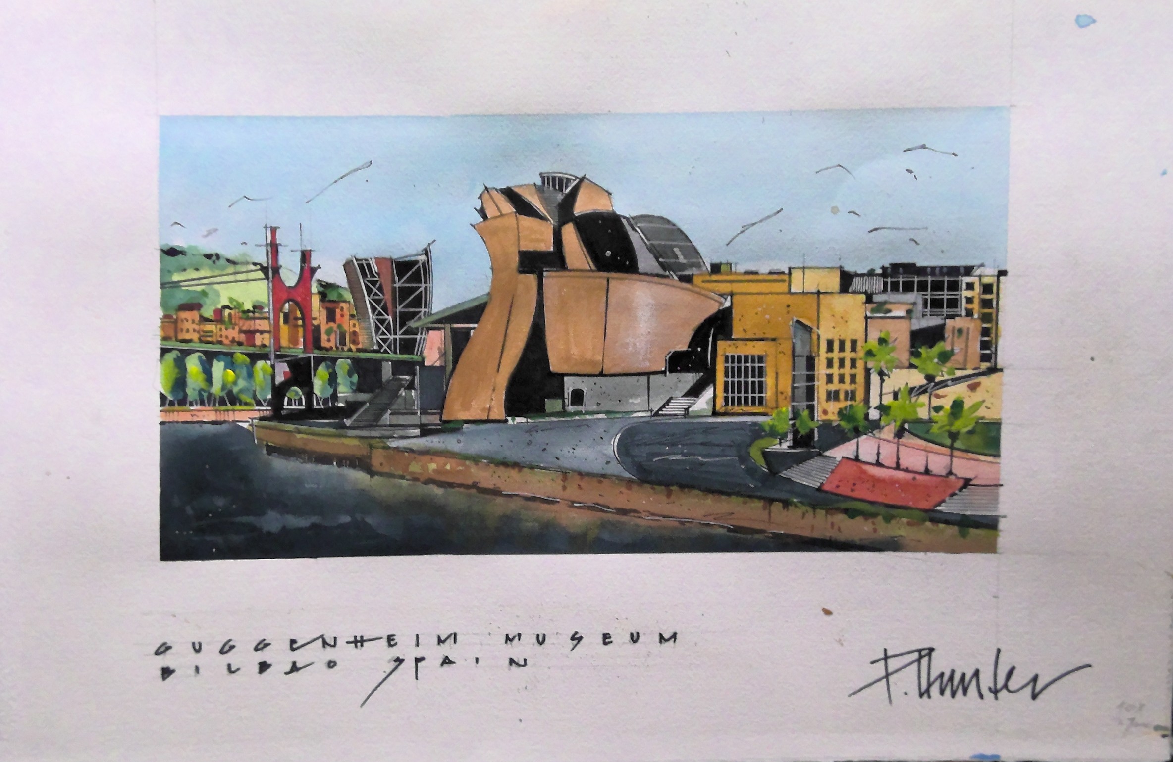 A city scape of places I have travelled to. A series of works. Original. Fabriano 300gm per sq metre. Guggenheim museum is famed for its architecture and innovation. Ready to frame.