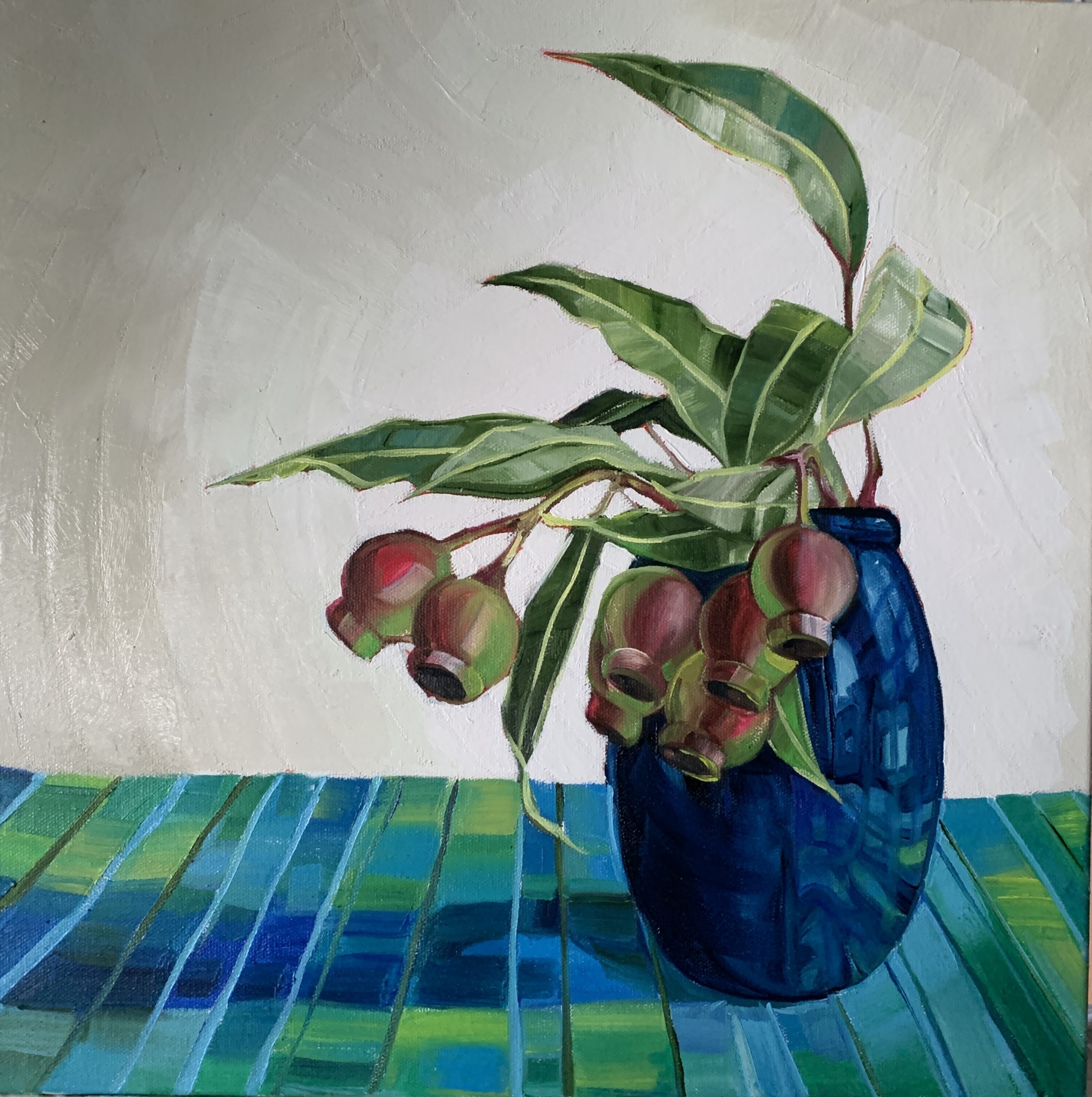Painted in oil paint, this is part of my current journey of Vintage finds in an Australian home landscape and the contrast of vintage materials against a sprig of an original and real Australian – the eucalypt.