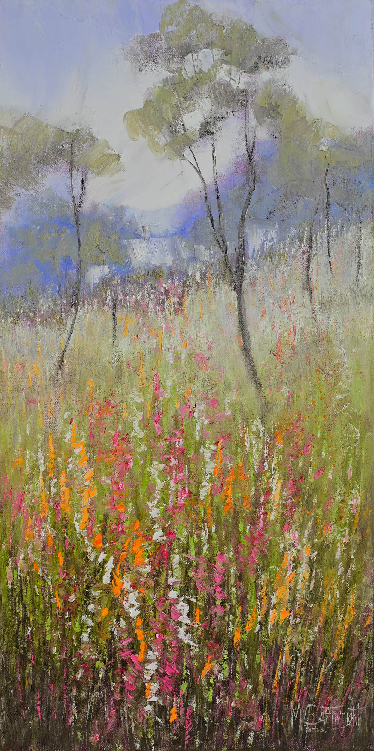 Wildflowers dominate the landscape adding color and beauty everywhere. I was inspired by these colorful wildflowers leading into the scene and towards the distant house.The location is the beautiful countryside of south Western Australia. A textured landscape spontaneously painted using a palette knife.