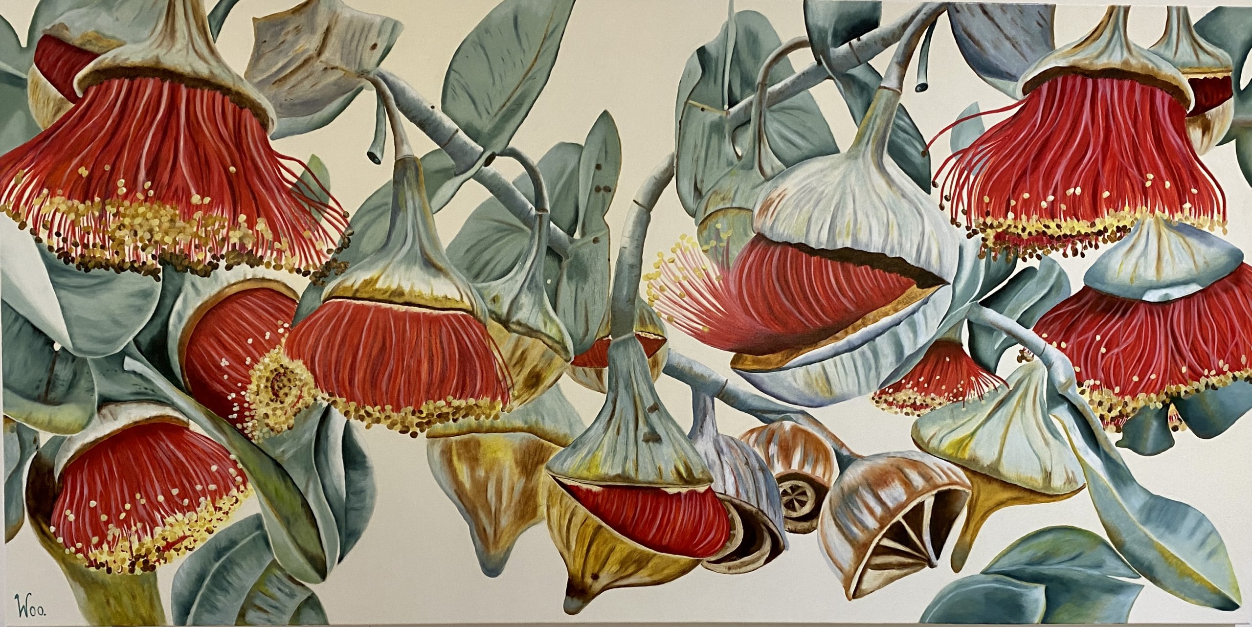How can you not love gum nuts, such an iconic Australian tree and so many different varieties, an endless source of inspiration and a joy to paint, large scale they look even more spectacular, the blue grey leaves with those bright red blooms make the artwork come alive and would look fabulous in a classic or contemporary setting as a standout piece.