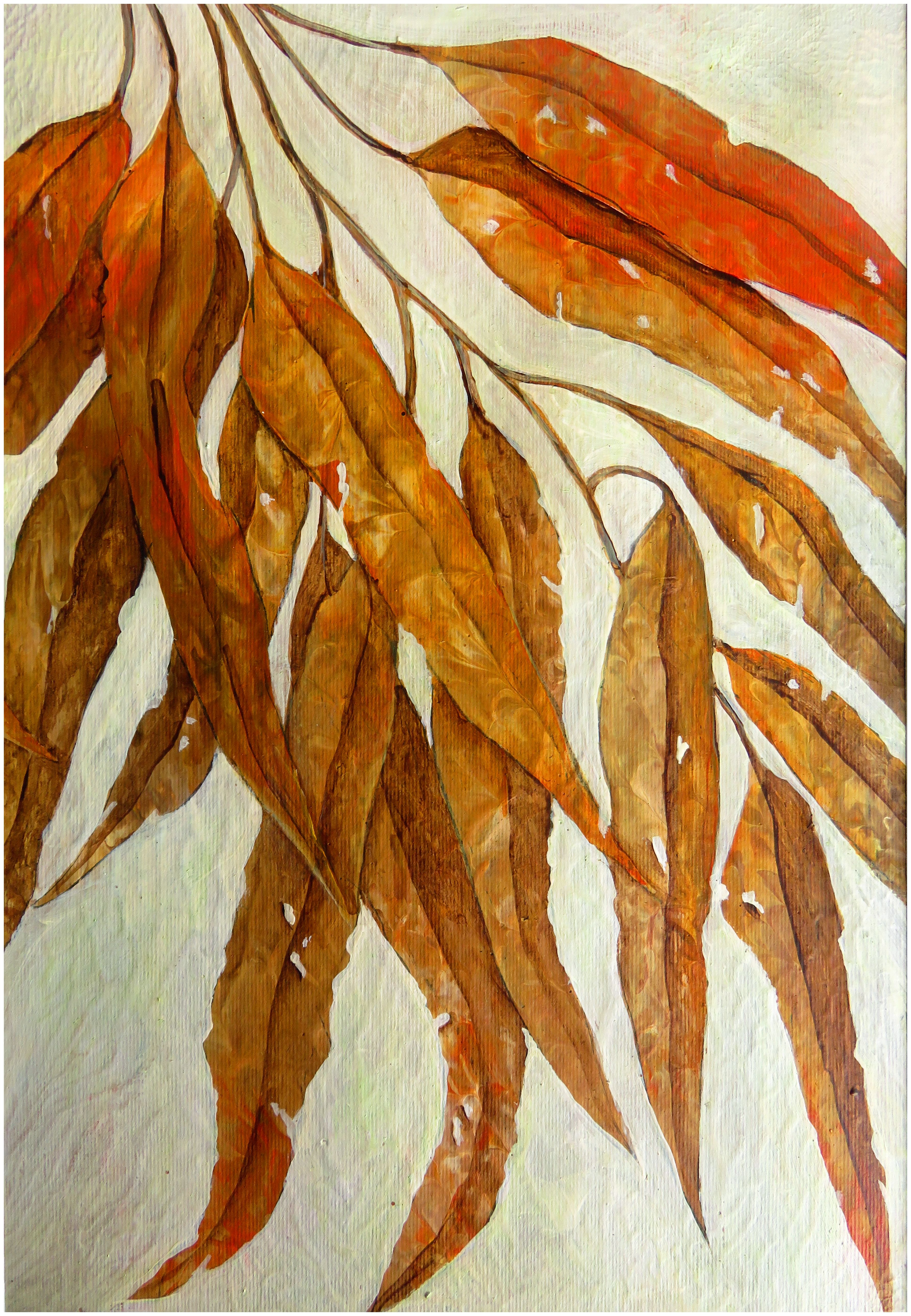 This painting started as a fluid acrylic pour with beautiful natural brown colours in many different shades that just reminded me of the brown tones of fallen eucalyptus leaves. So, I collected a bunch of the colourful autumn leaves and laid them out for this painting. I used the negative painting method to give these leaves their natural shapes.