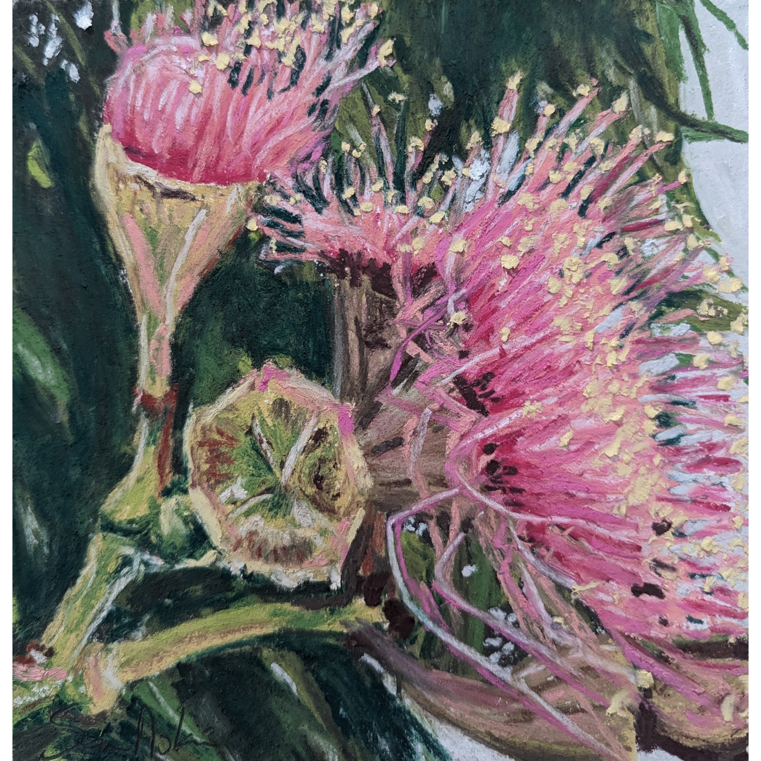 Being Summer, I am surrounded by gums/Eucalypts, and their amazing flowers. In the art world, it seems everywhere I look is another painting of gumnut blooms… I have been burning to paint some myself for a while, and couldn’t miss the boat. This is my first gumnut flower, but certainly won’t be the last!