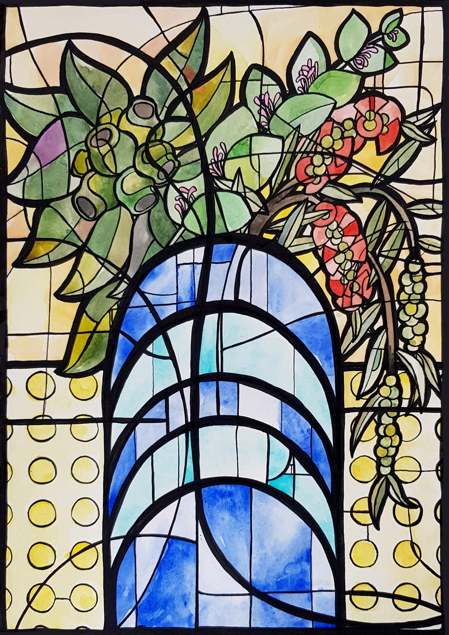 The art deco inspired arched vase is filled with washes of blue which contrast with the yellows in the tablecloth and background. Stylized bottlebrush and hakea flowers and large gumnuts fill the vase. The leaves and flowers are filled with washes of watercolours and defined by ink linework. Secondary linework dissects the image, giving a look of stained glass.