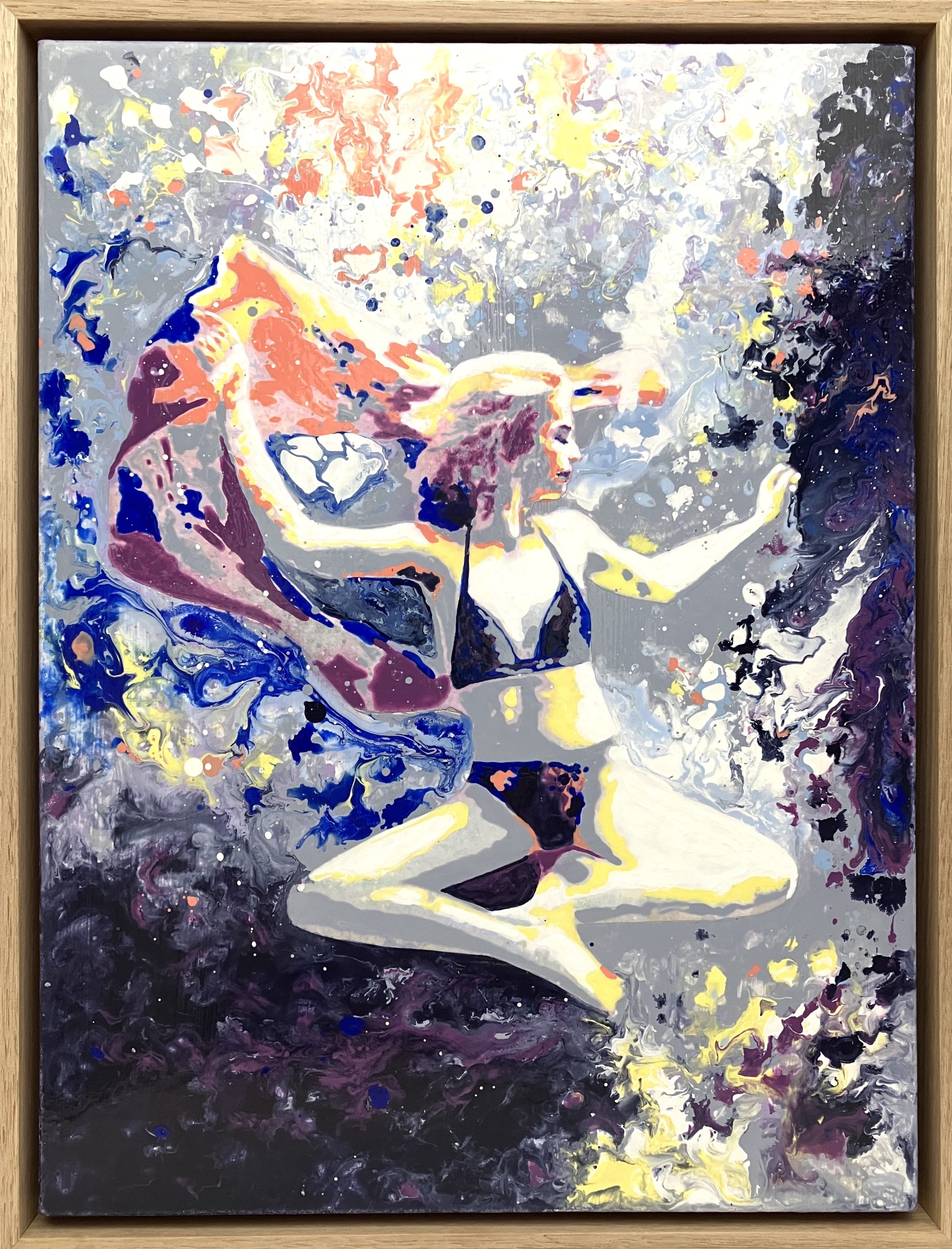 “Had I the Heavens” is named after the first line in W. B. Yeats Poem “Aedh Wishes for the Cloths of Heaven” where Yeats explores the idea of wanting to give gifts to someone you love, but having only the greatest gift of all, your dreams, to give. This is how I feel looking at this painting of my beautiful daughter who is my model – I want to give her the world!! Inspired by the streaming sunlight that envelopes her from a photo captured underwater whilst on a photo shoot in Bitter Springs, Mataranka, Northern Territory. I loved how the light captured the small particles floating up through the water into the light and her carefree and open pose. Bright and contrasting colours of the season – orange and blue, purple and yellow – with a backdrop of grey – to give that fresh vibrancy that would be perfect for the beach house or the pool pavilion.