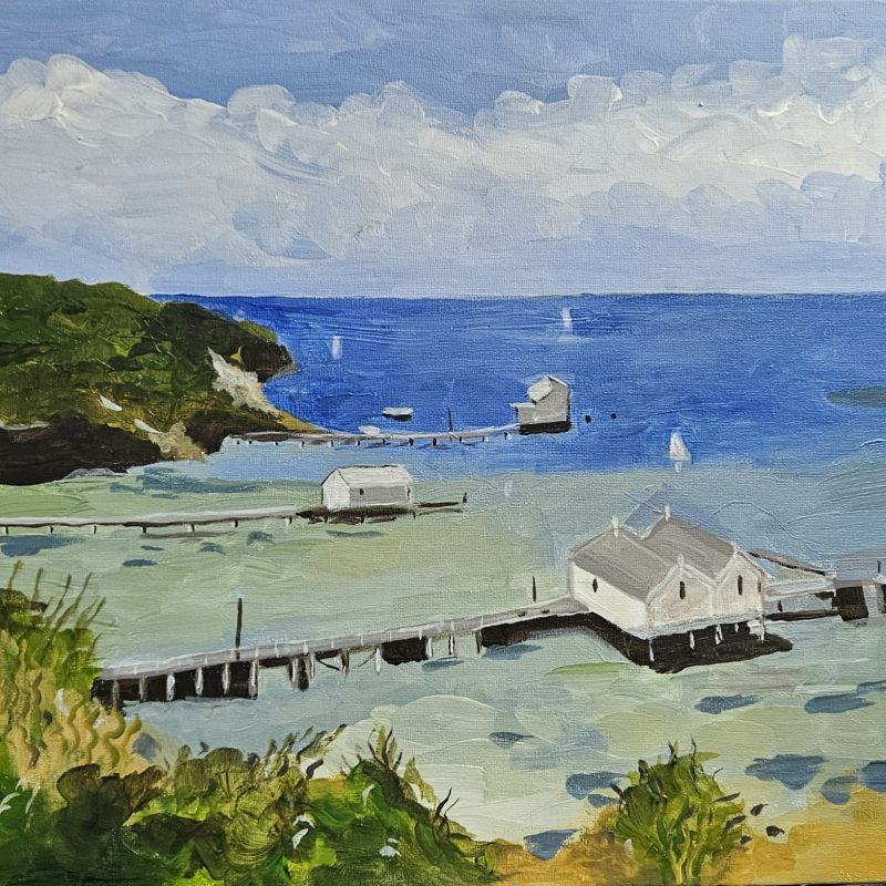 In this richly layered landscape-format painting, banksias, hakeas, and delicate crucifix orchids emerge through negative painting like treasures revealed in mist. Smoky shadows drift behind crisp silhouettes, giving the scene a mysterious, almost cinematic depth. Olive greens mingle with bursts of warm orange, their tones shifting subtly through the intricate layers of texture built up beneath. The banksias stand bold and architectural, hakeas curl with quiet elegance, and the orchids punctuate the scene like tiny sparks of celebration. It’s a bushland story told in whispers and glows, pulling you in to explore every hidden fold and flicker.