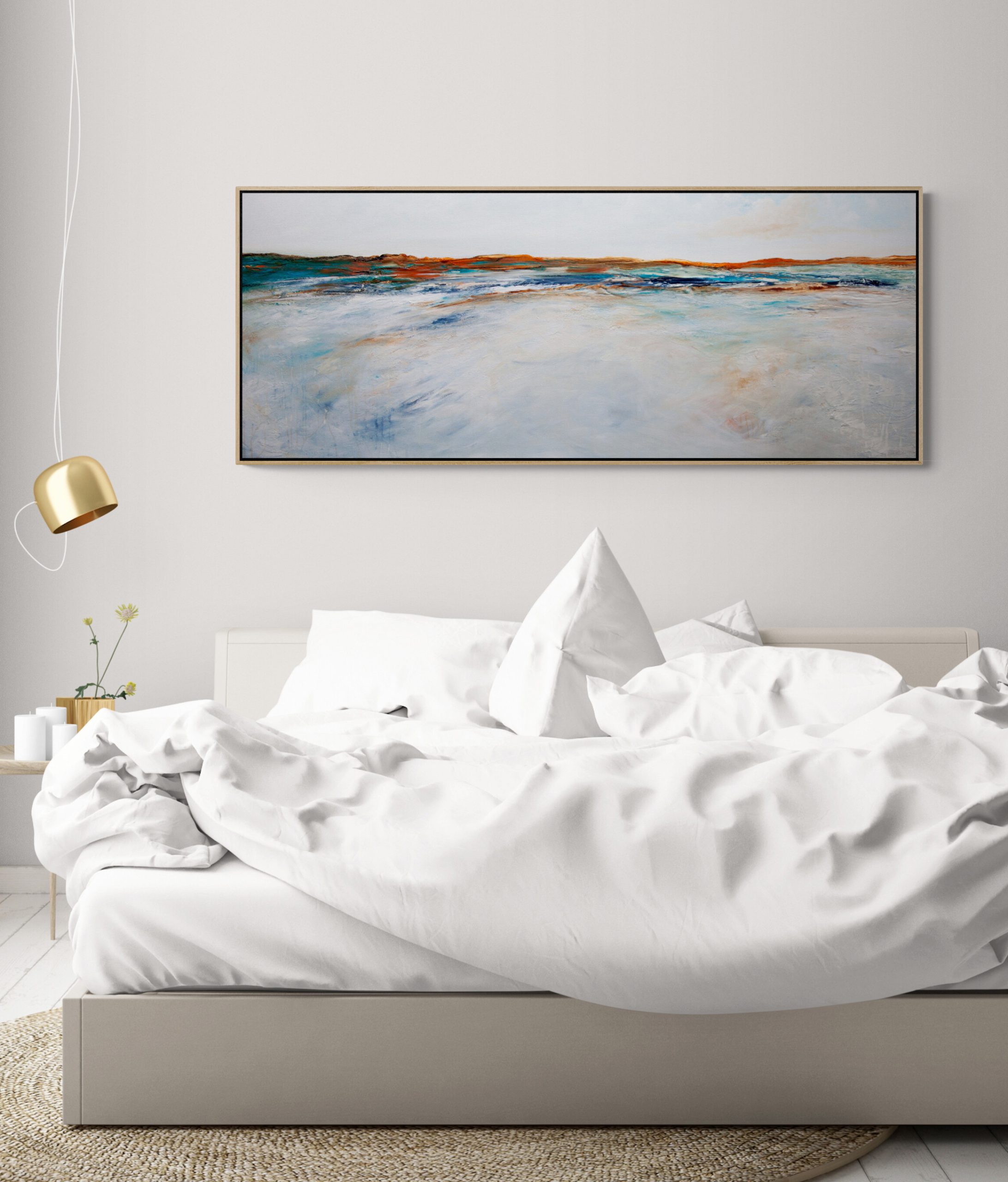 Half Way Rock by Tania Chanter is inspired by the rich and vibrant tones of the Australian seascape and the changes of light and mood throughout the day. Tania’s hope is that this painting brings a sense of calm to the room where it lives, and that is makes the people who enter the room feel as though a part of nature is right there with them.