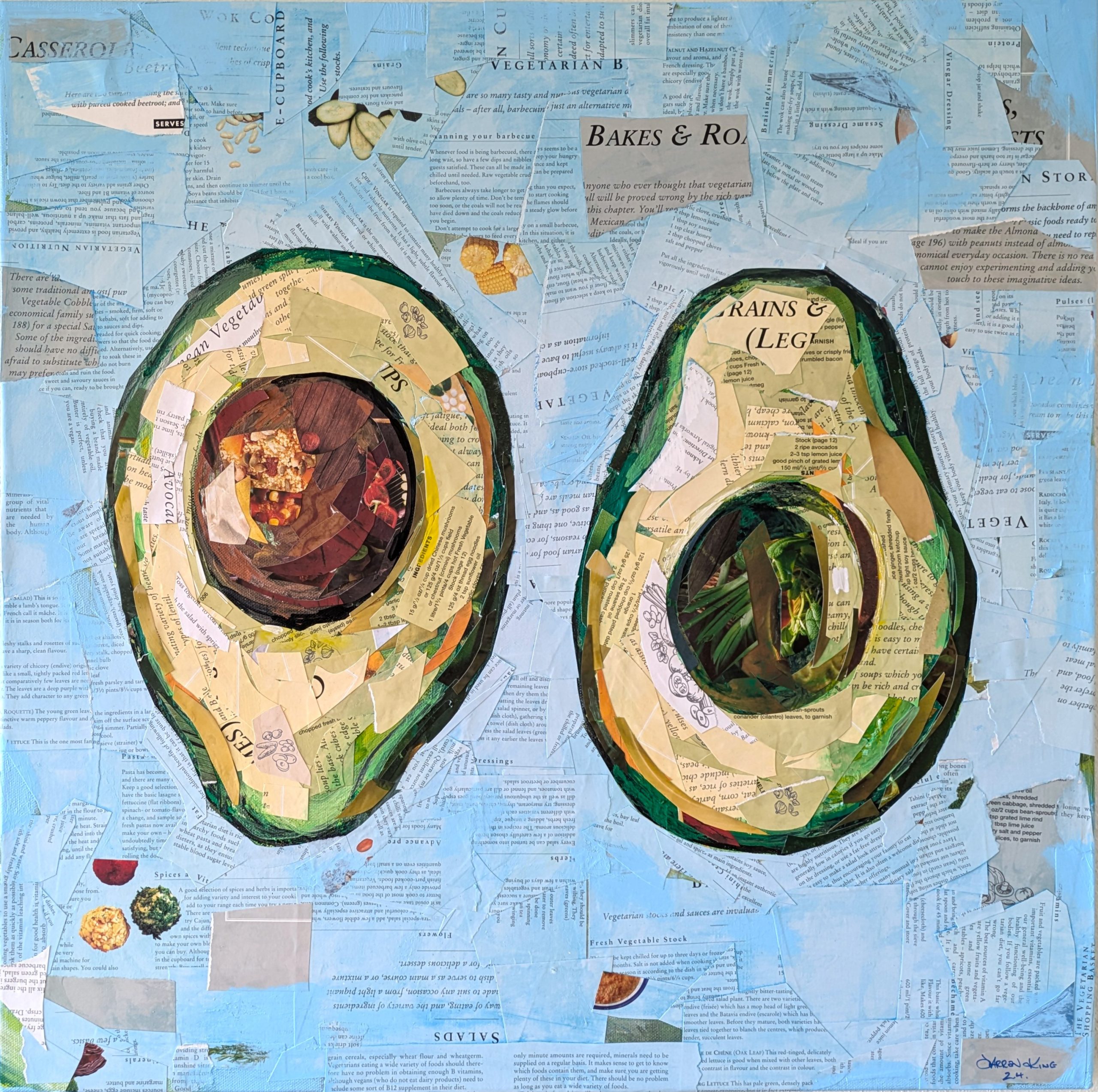 All paper elements used for this piece have been taken from an old cook book. (as pictured). The Complete Book of Vegetarian Cooking.