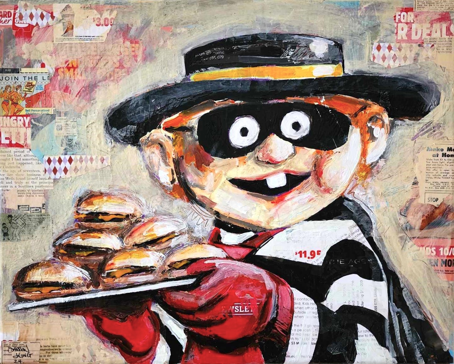 Cut/torn recycled paper collage gouache posca pens and acrylic paint on stretched canvas
