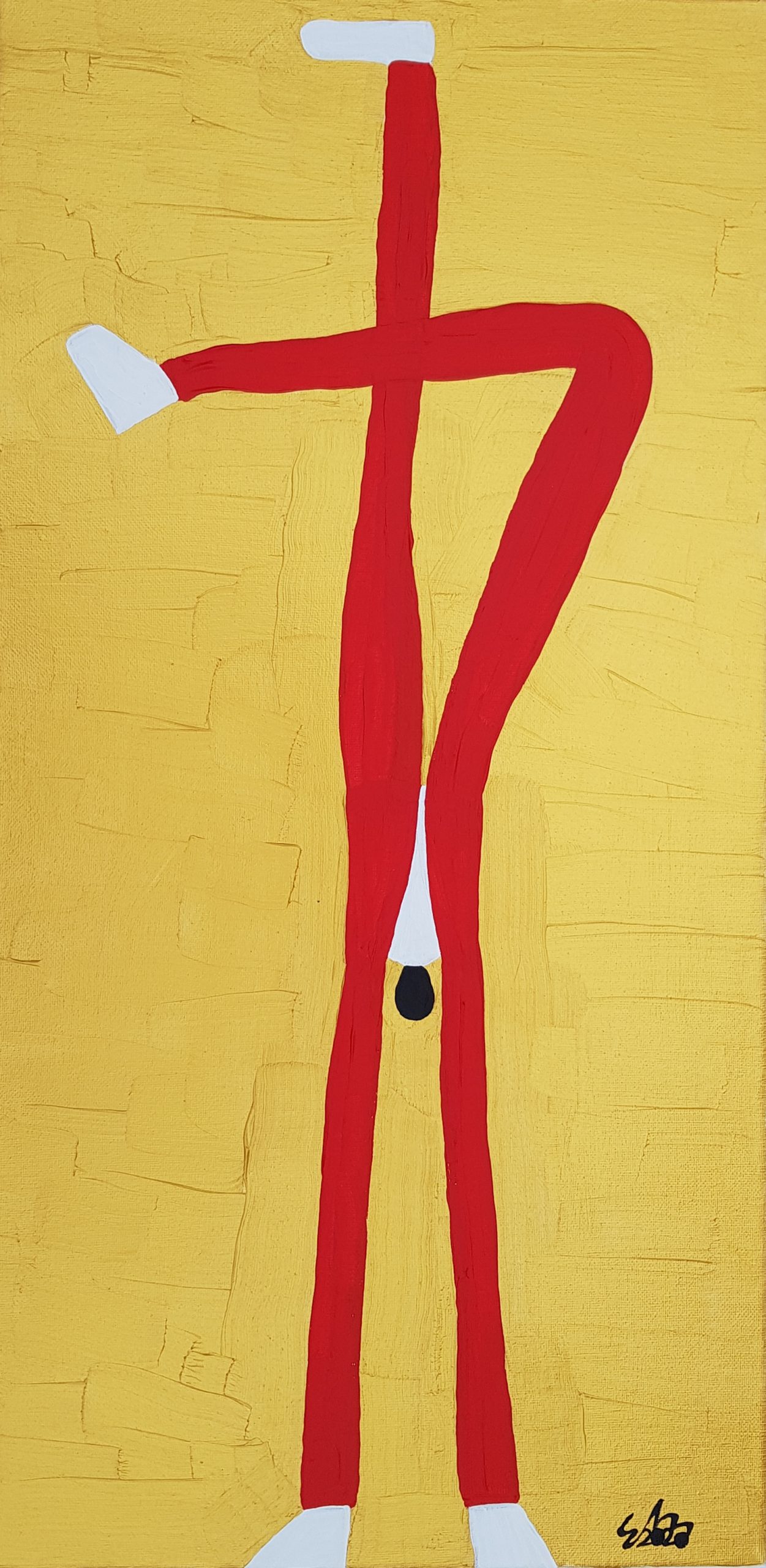 A man dressed in red suits, wearing white gloves and shoes is doing a handstand