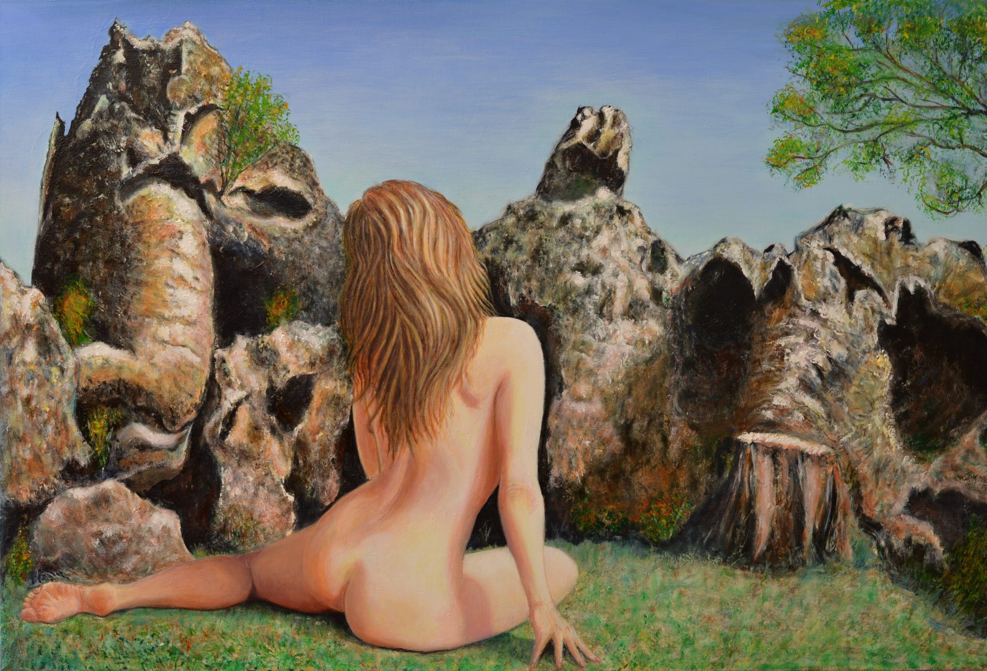 Hanging Rock – original nude, figurative painting in a landscape on stretched canvas.