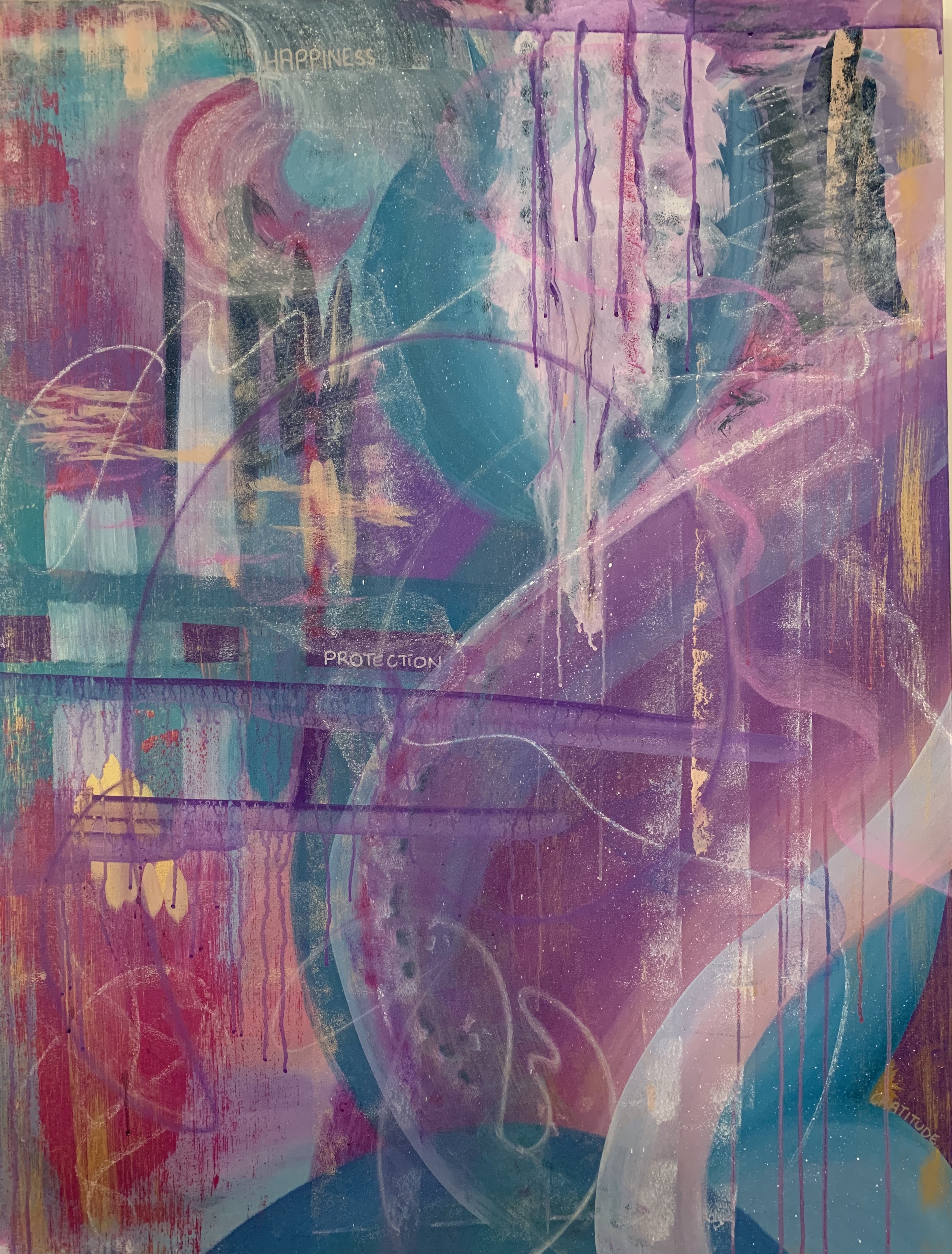 My favourite colour (my whole life) has always been purple, closely followed by pink. Recently I’ve also fallen in love with turquoise/teal blues. I wanted to combine all my favourite colours in the one painting…so I did. I wanted it to be colourful, and uplifting to the viewer. To help with that, some positive words have been included in the painting.