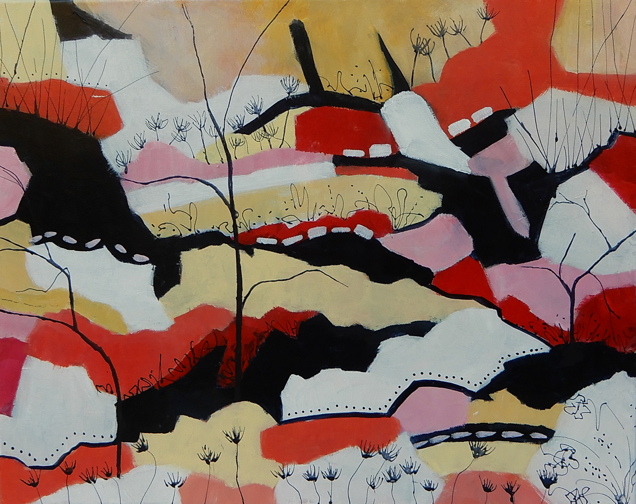 Happy Days by Doodie Herman -I find myself drawn to bright, happy colours as winter’s chill arrives and the days get shorter. Using this palette somehow dictated the composition of the work as I explored the shapes that emerged from the layers of paint.