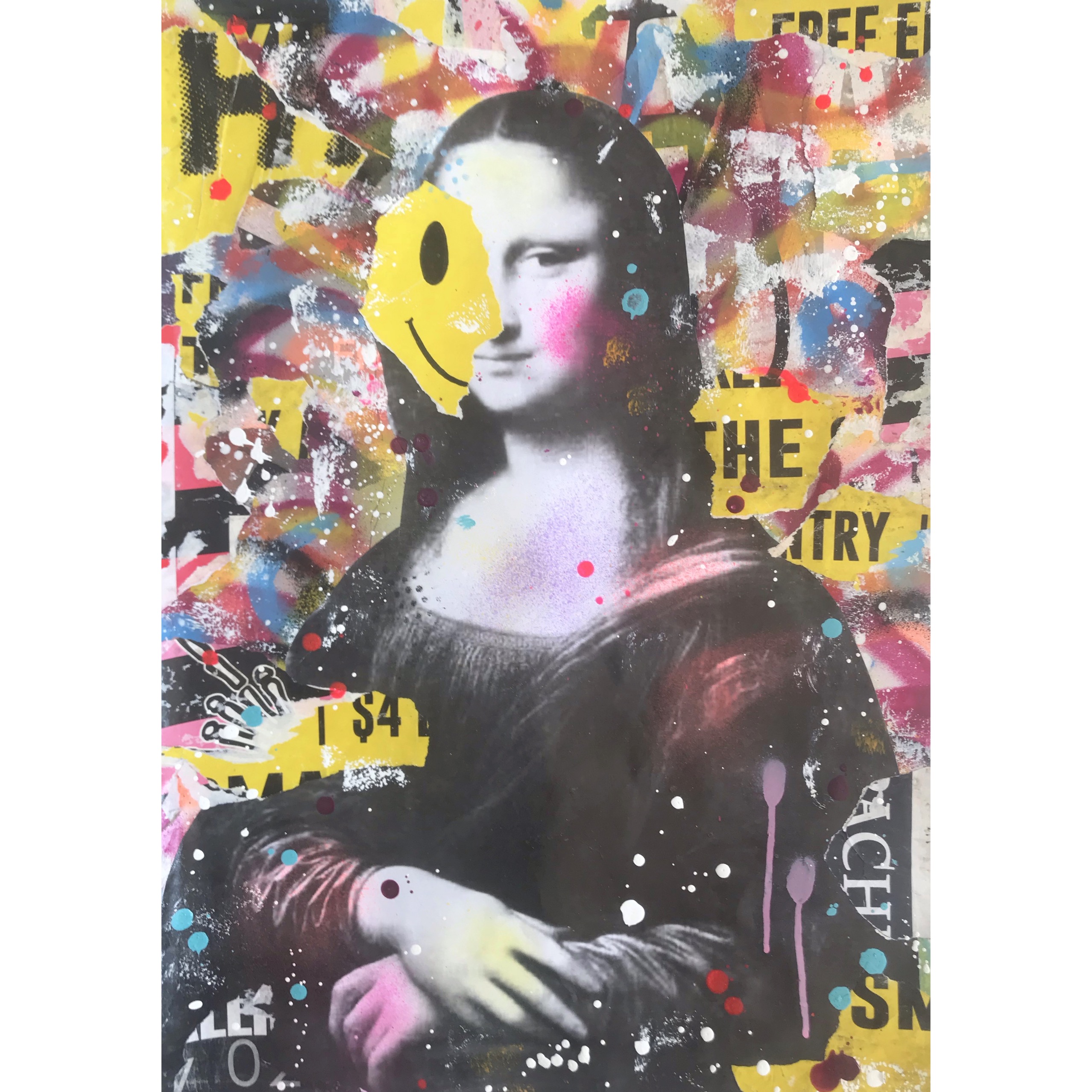 This artwork has a textured finish created by built up layers, paint splatters and torn paper, a visual effect mimicking the look you would see in the street where this effect is created over time. These imperfections are part of the overall look and feel of the finished work.