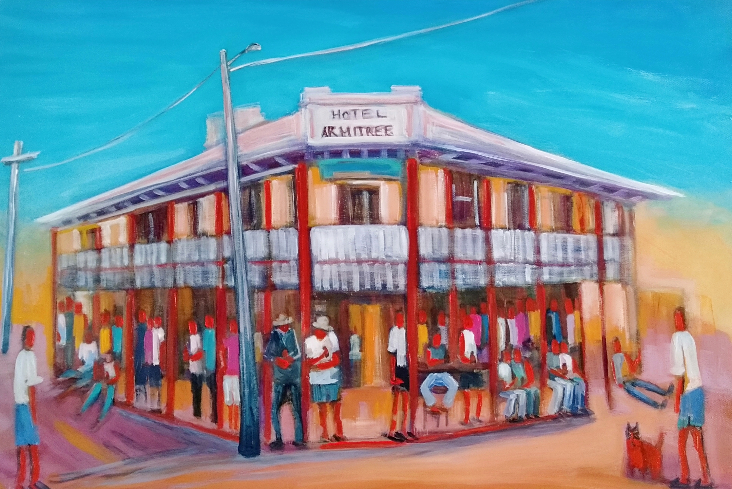Happy Hour, your shout by Angela Mulligan – Narrative expressive piece Australian outback pub Everyone from the town is here to celebrate the pubs are open once again. Bright coloured palette of colours capturing the warmth of the sunny day outback. Will enhance any space in your home or office. Original artwork . ready to hang