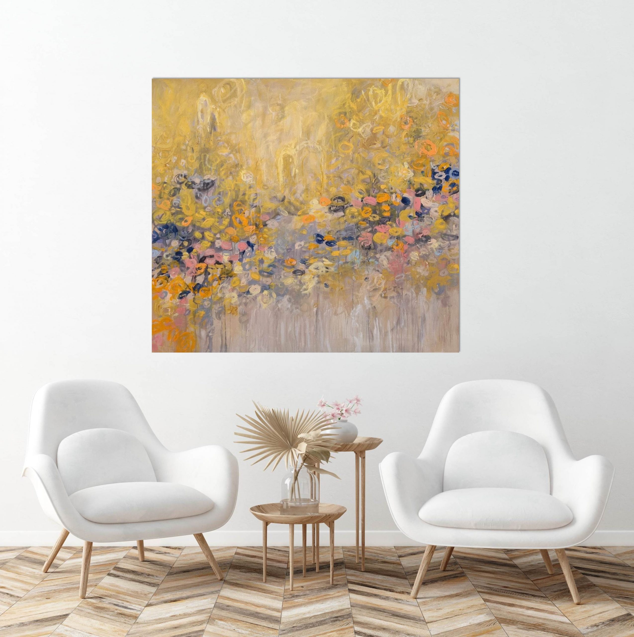This artwork is finished with a subtle satin protective finish and matte white edges. It’s feel within a room is expressive and upbeat yet gentle and quietly stunning; sure to make an appealing feature, at home equally in a domestic interior or corporate space.
