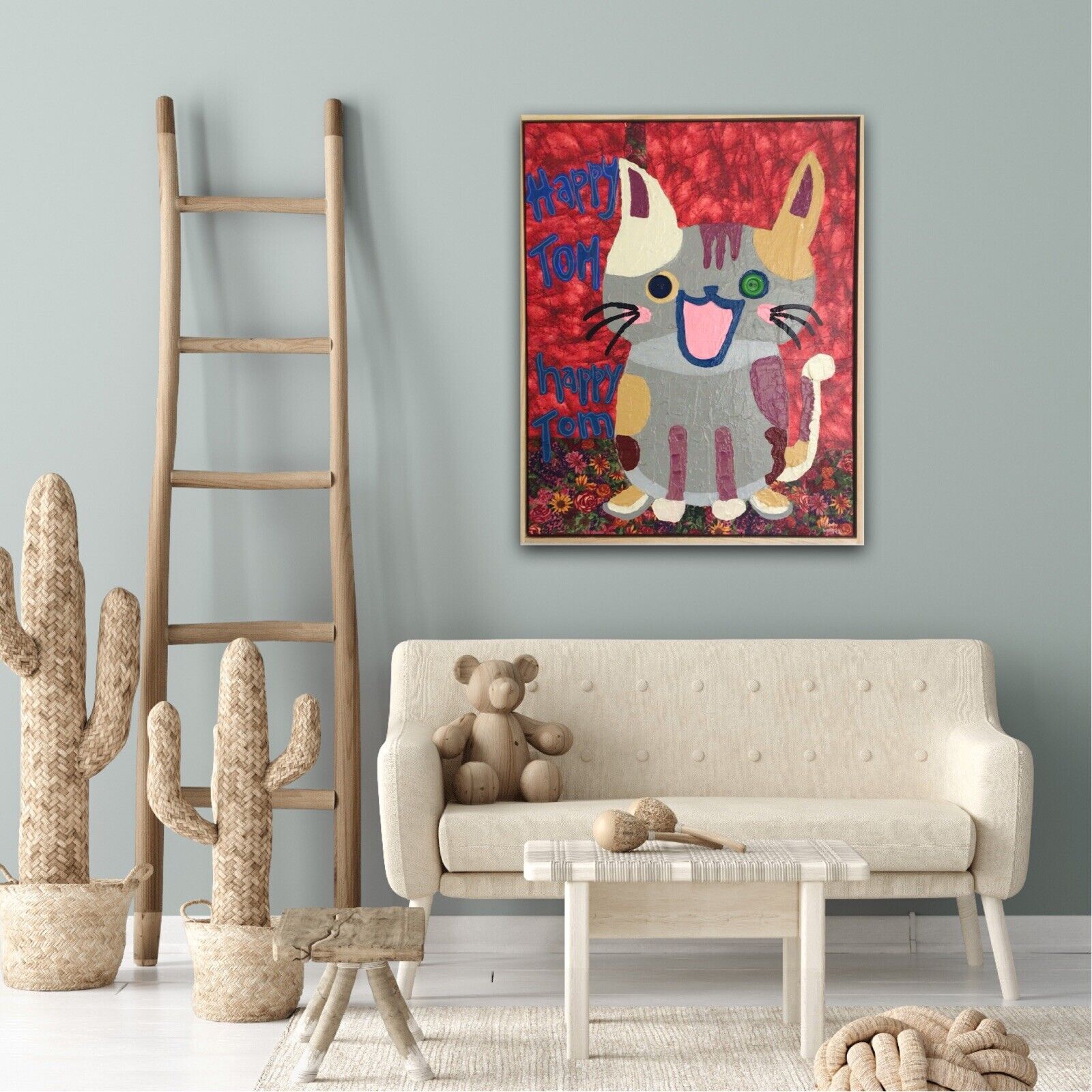 Acrylic Fabric Collage Cat Animal Painting Framed