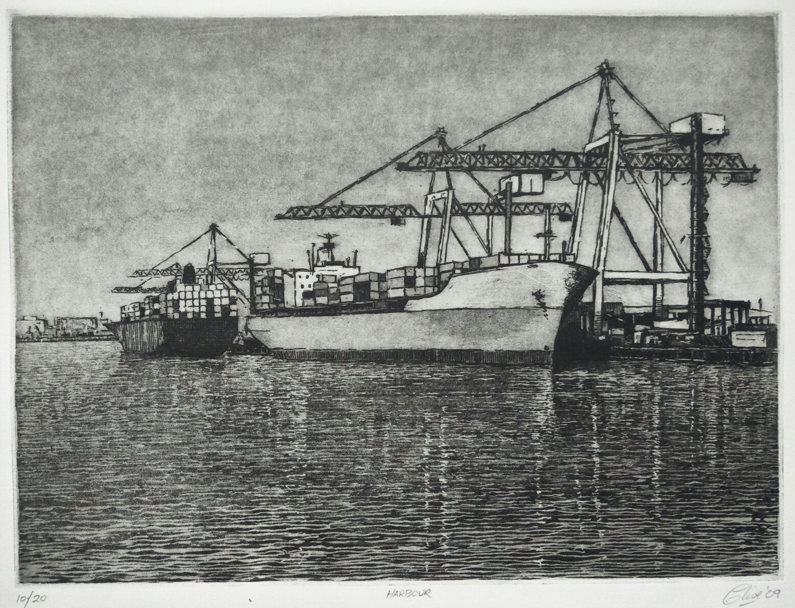 Harbour by Clive Dickson – Aquatint etching – limited edition (20). From a series based upon Victorian water courses, exploring both urban and rural locations, from rivers to streams to creeks, from waterfalls to still waters.