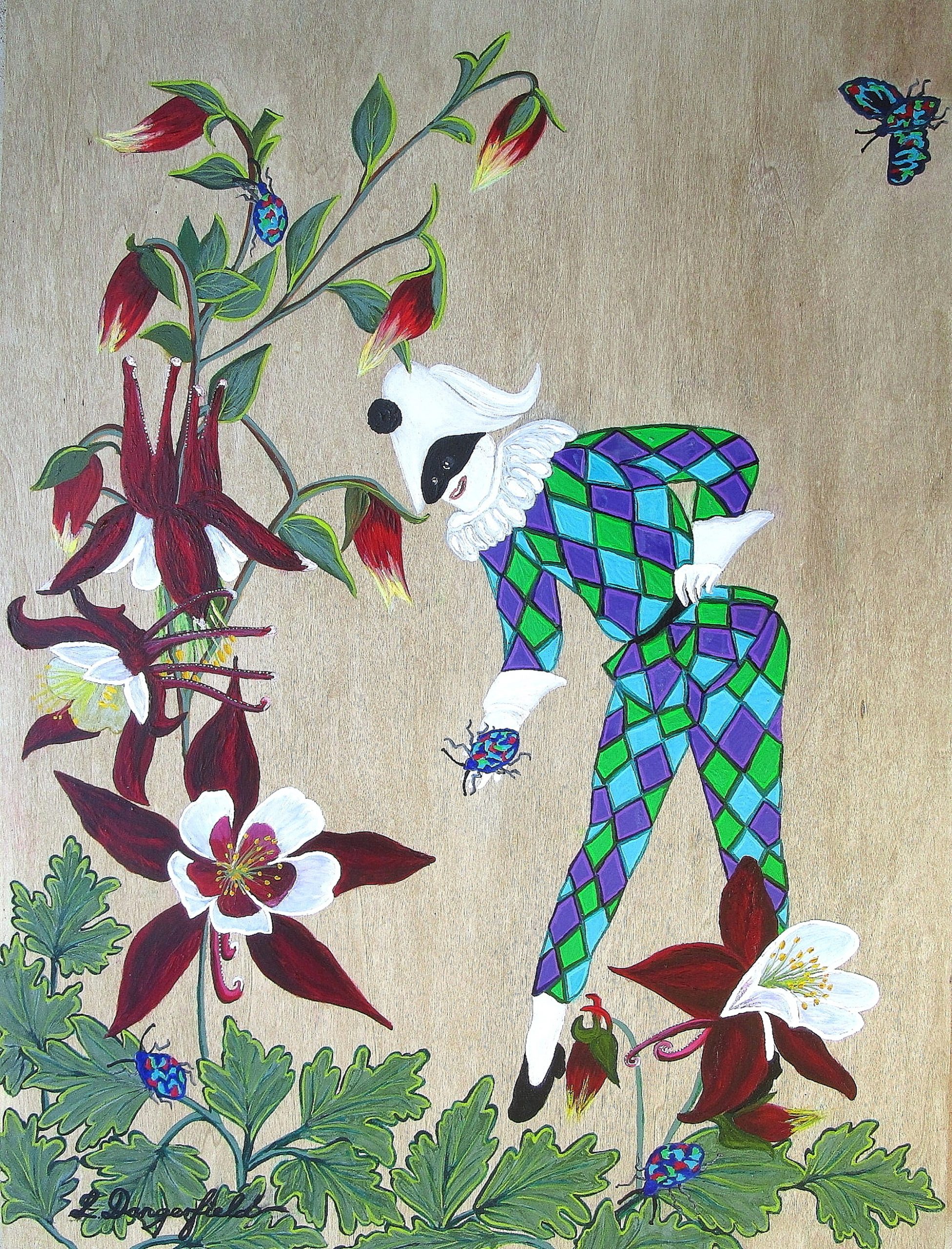 I have just added this beauty to my homonym inspired series where each of two or more words having the same spelling or pronunciation but different meanings and origins. On this occasion I have depicted the harlequin clown and harlequin beetles. The composition didn’t feel complete so I added the rich red columbine flowers to create this quirky image. Maybe I’ll do another one with Columbine, the beautiful dancer and some columbine flowers in the future. This painting will surely be a conversation piece.