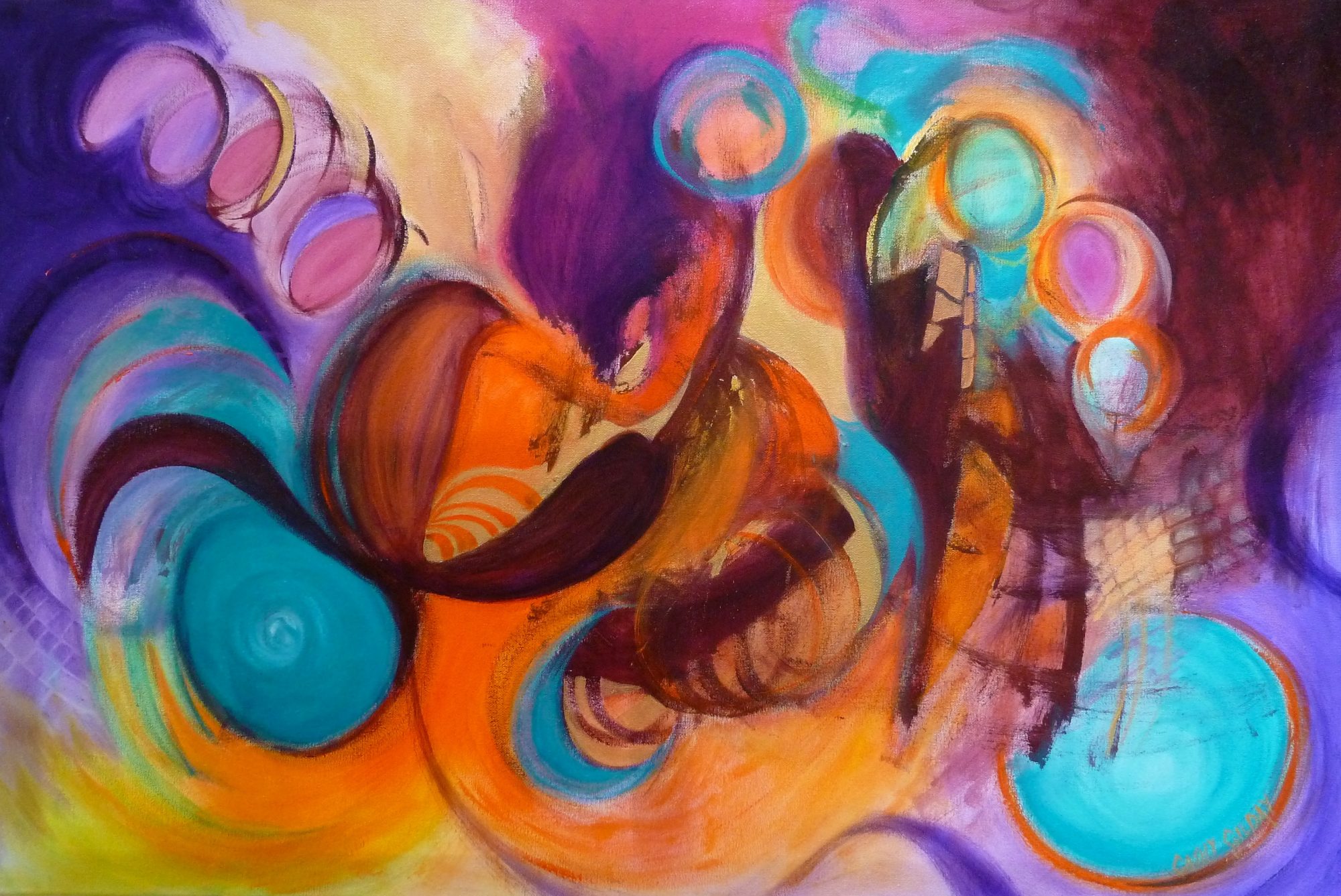 Harmony by Cathy Gilday With a musical rhythm, this colourful abstract, has large circular shapes and beautiful tones. It exudes a wonderful energy and a a feeling harmony.