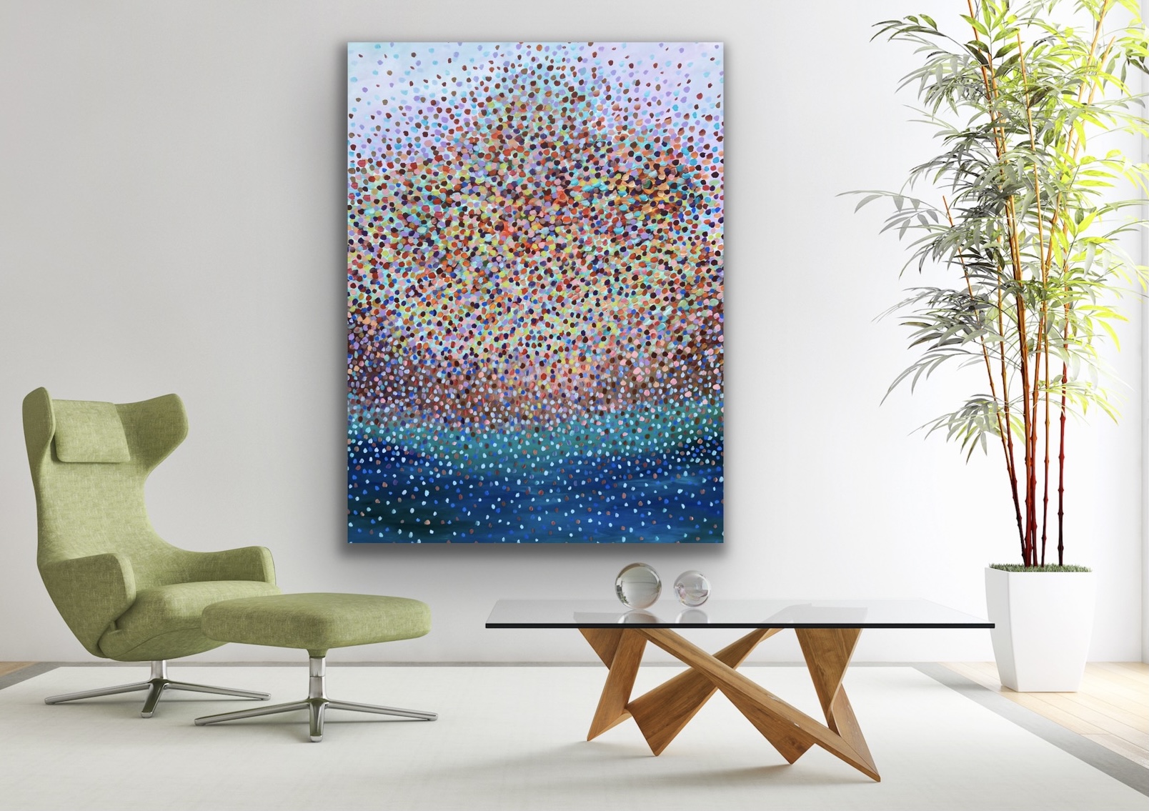 Harmony  by Theo Papathomas –  a beautiful cloud of Petals over the sea swept by the winds creating an explosion of fireworks of Petals lighting the whole sky. Beautiful warm and cool colours of petals flying in the wind falling over the seascape creating this bouquet of colours. Petals weeping onto the sea creating this beautiful veil of colours covering the whole seascape . A composition of colours and rhythms of petals like stars dancing over the sea. A very peaceful and tranquil painting with so much depth . This painting is painted on linen .The painting is signed and dated 2021 at the back and comes with a certificate of Authenticity.