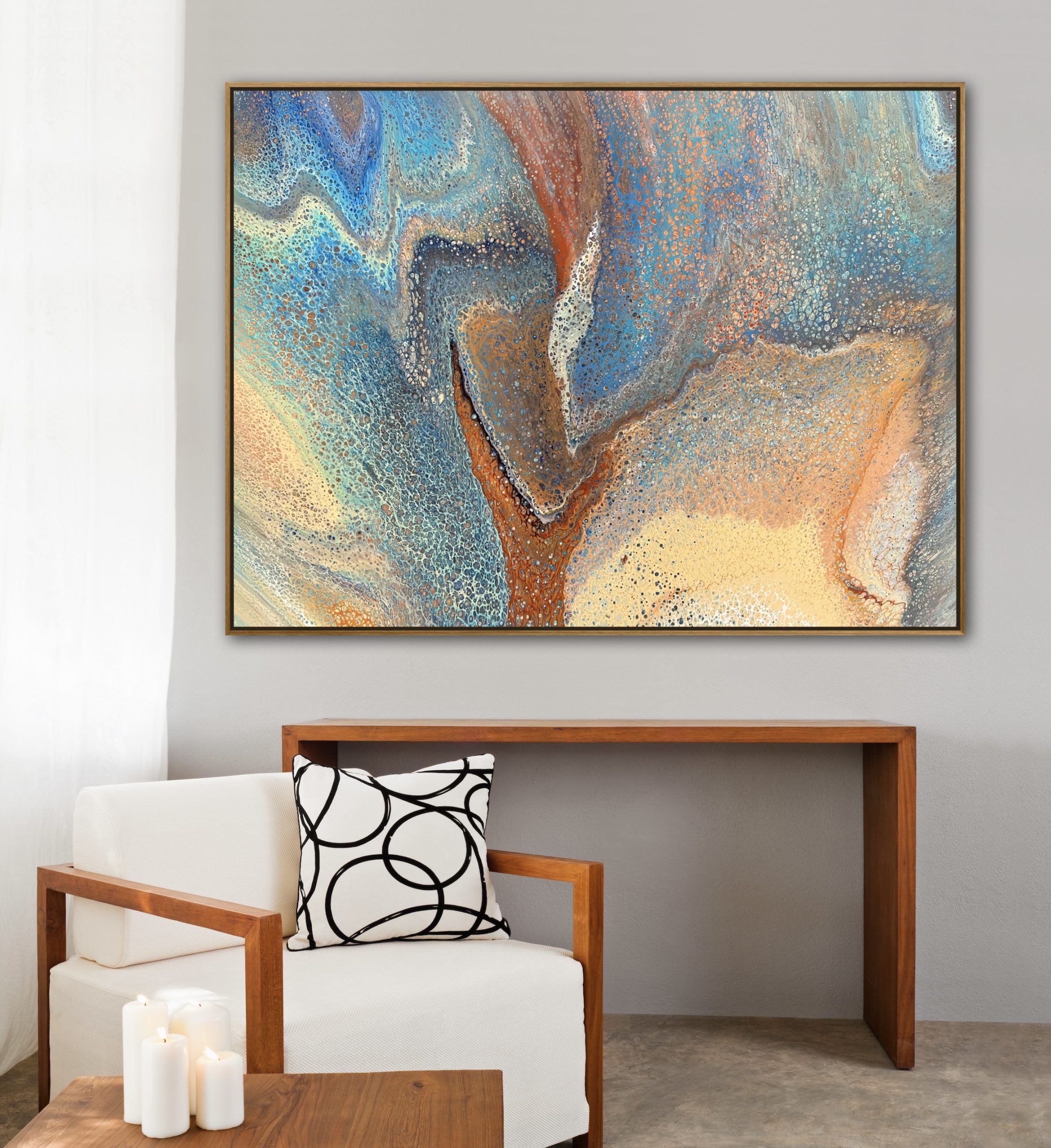 Harmony was created using various techniques combined to allow increased flow, interaction and separation of colours to create interesting patterns where pops of colour can be seen emerging from underneath. This added dimension adds lace and cells to the artwork creating an interesting and one of a kind painting that can never be replicated. A lovely variety acrylic pigments were used including metallic yellow & rose gold, bronze, copper, silver, grey, cream, yellow, blues, black and white.