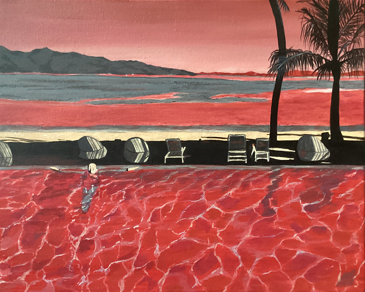 “I am a big advocator of manifesting your life. My daughter had the opportunity to work on Hayman Island on the Great Barrier Reef and I was fortunate enough to share a moment of her dream life with her on the island. “Hayman in Red” is an interpretation of a photo that my daughter took of me on Hayman Island. I chose reds to symbolise life force, energy and courage – things that this day was full of. I proudly submerged myself in the water after a day of adventure and fun.”