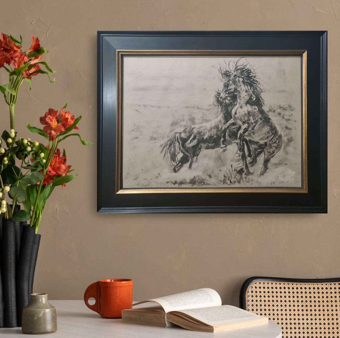 Willow Charcoal, Yellow Ochre pan pastel and Colourless Blender on Strathmore Toned Tan paper, framed and ready to hang.