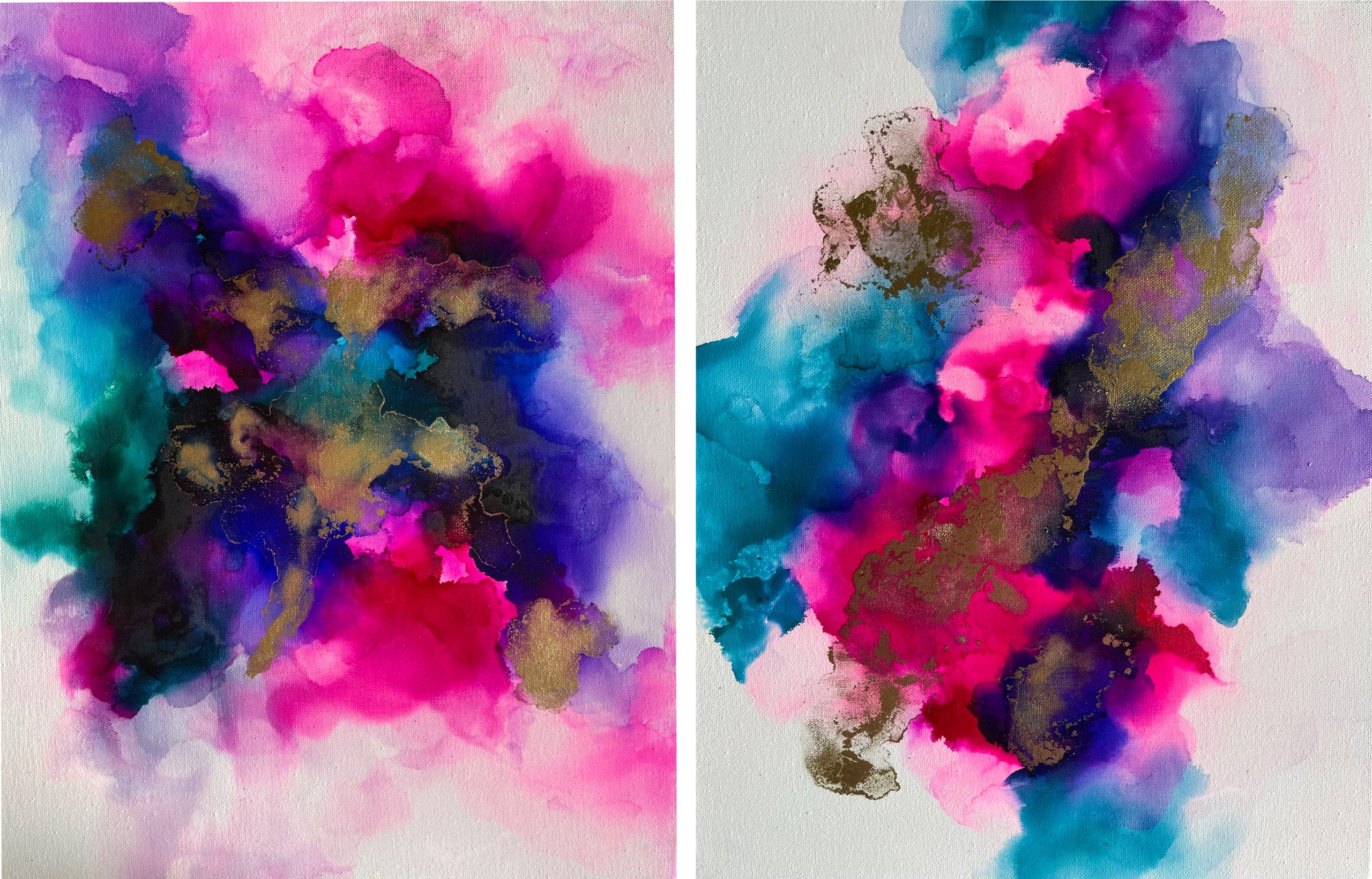 This diptych has been produced with alcohol ink on canvas. I have titled it Head in the Clouds because the way in which the colours overlap and combine reminds me of a whimsical sky. The darker tones in the centre of each canvas lighten and spread as they drift to the edges. The addition of gold in the work catches the viewer’s eye and draws them into the intricacy of the colour.