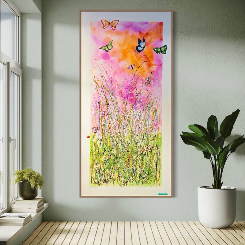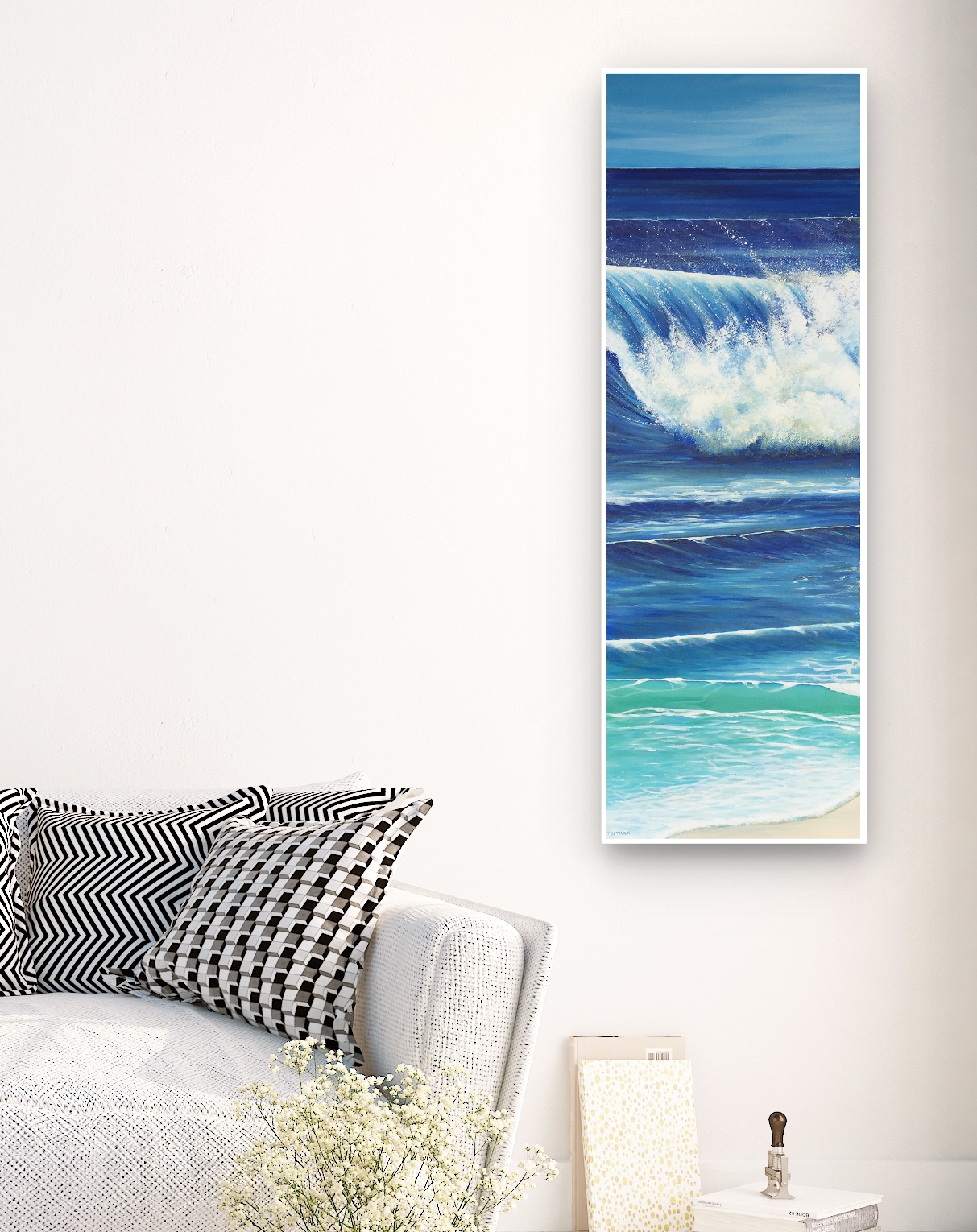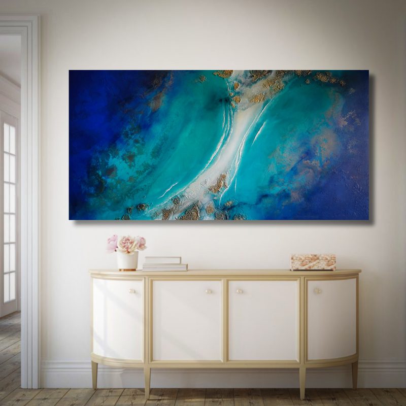 Quality acrylics used giving long lasting rich pigmentation/lustre. Designed on acid free environmentally unbleached cotton duck, triple coated with universal primer, gallery style folded corners. Protective Matte varnish to protect work. Ready to hang.