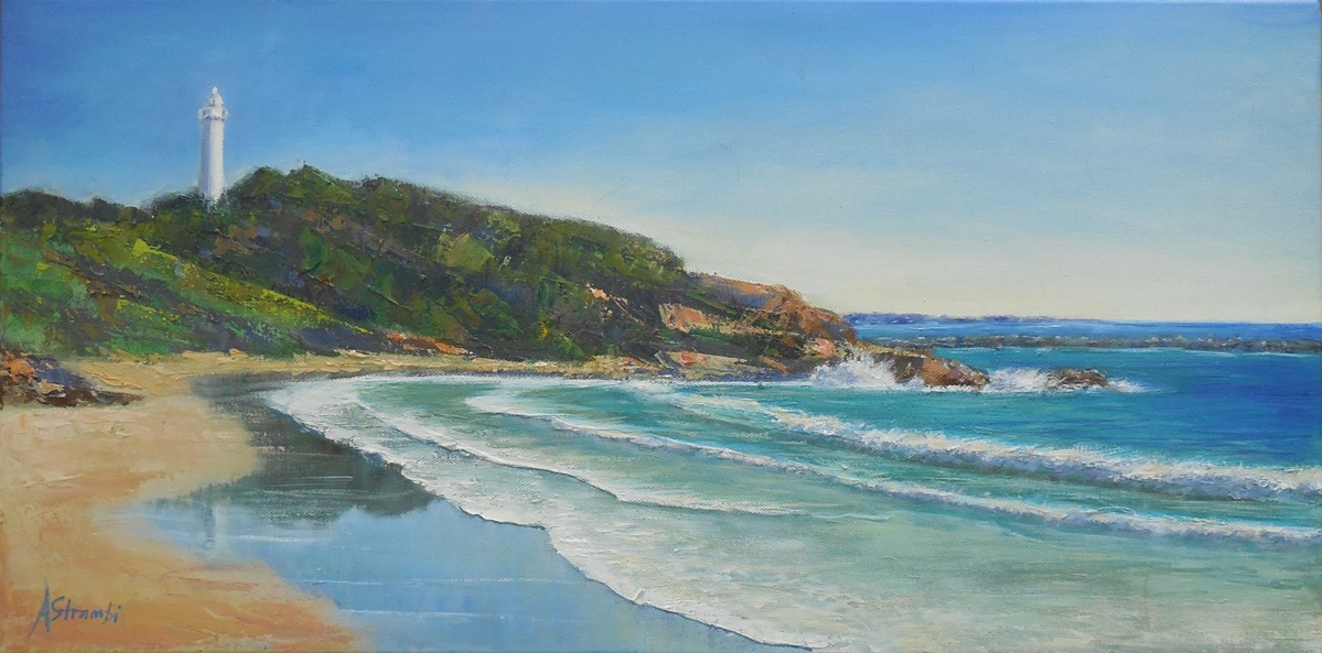 Yamba is one of my favourite beach locations with lots of memories of family holidays. I love the idea of the lighthouse, guiding fishermen and sailors back safely to shore. I have painted the morning light and reflections in the water and on the sand.